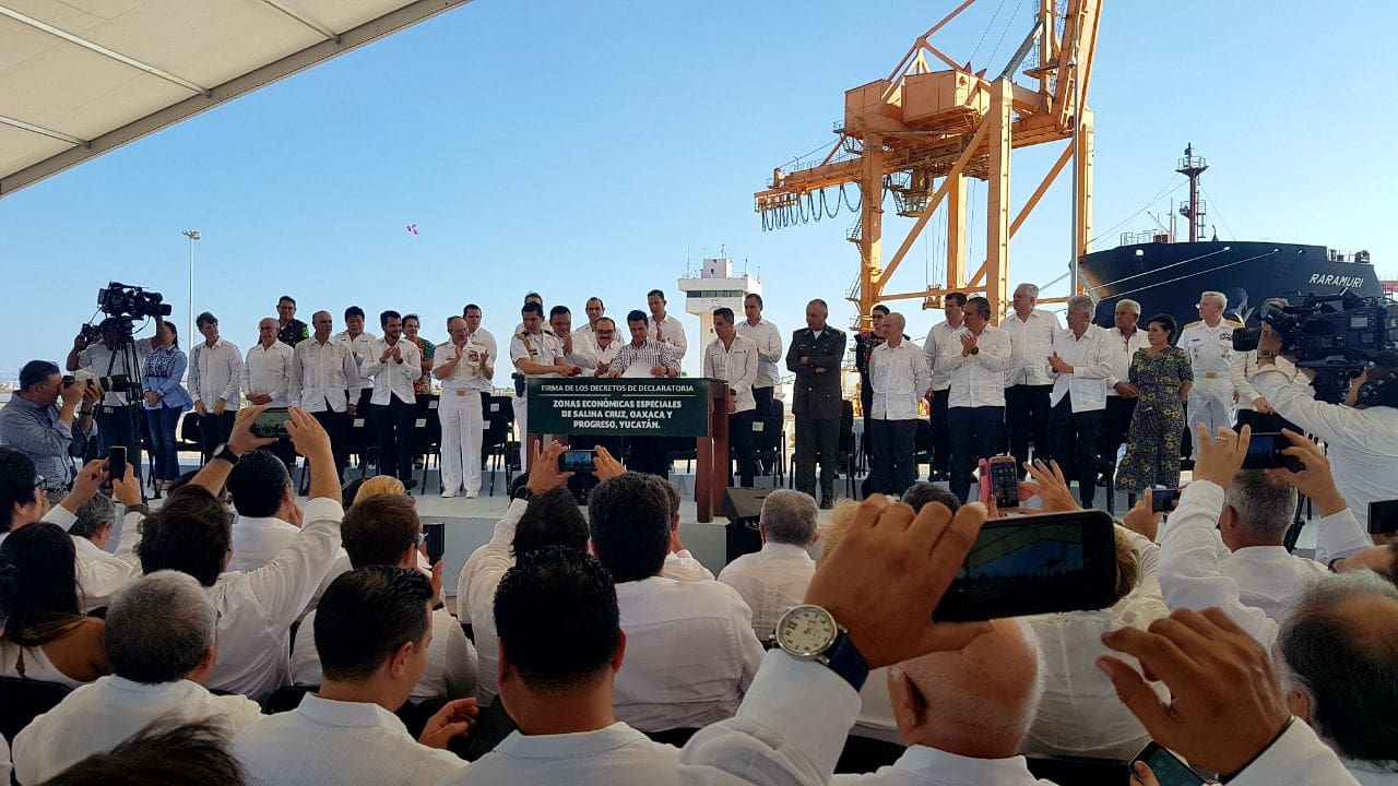 El anuncio se realizó en compañía de los gobernadores de Oaxaca, Alejandro Murat, y de Yucatán, Rolando Zapata Bello; así como titular de la Autoridad Federal para el Desarrollo de las ZEE, Gerardo Gutiérrez Candiani, así como de los secretarios de Estado Enrique de la Madrid (Secretaría de Turismo), Rosario Robles (Sría. de Desarrollo Agrario, Territorial y Urbano), Salvador Cienfuegos (Sría. de la Defensa), Vidal Francisco Soberón Sanz (Sría. de Marina), José Antonio González Anaya (Sría. de Hacienda), José Calzada Rovirosa (Sría. Agricultura) y Gerardo Ruiz Esparza (Sría. de Comunicaciones y Transportes).Qué es una Zona Económica Especial?