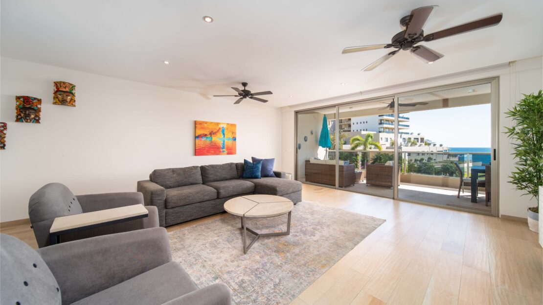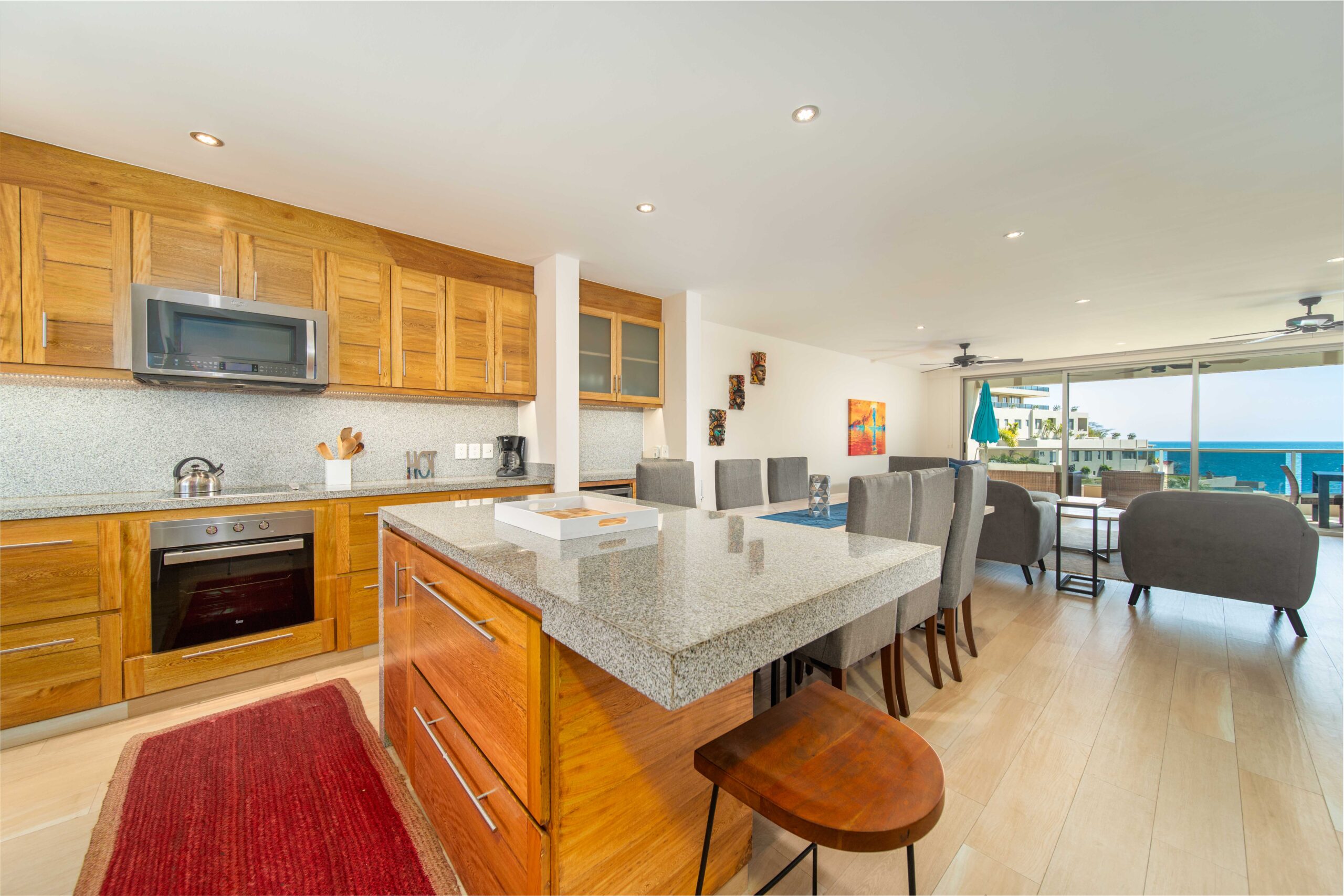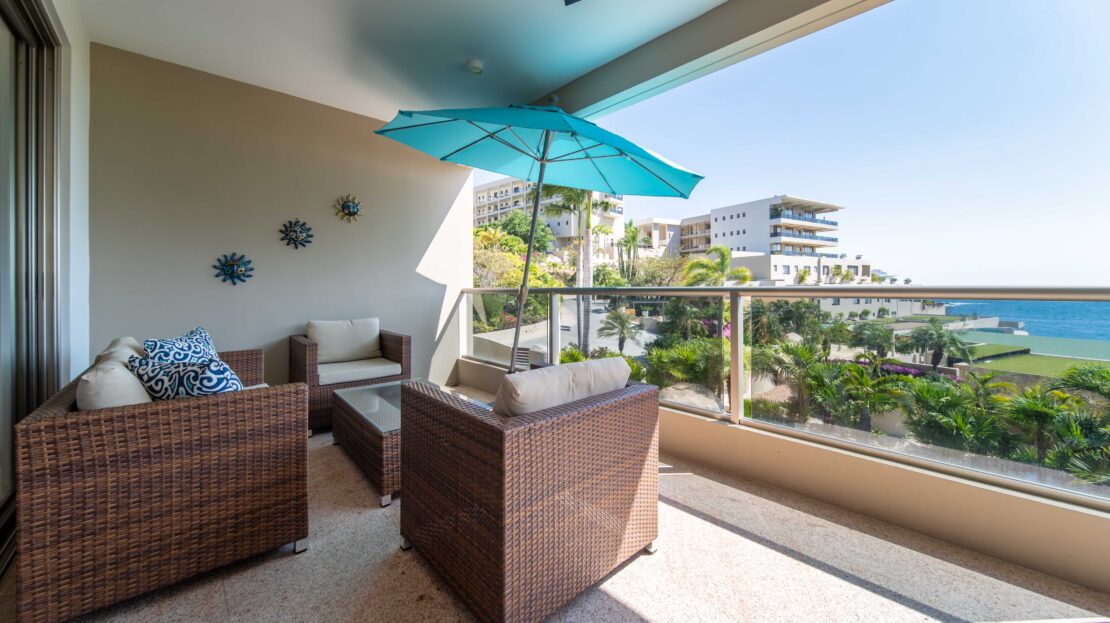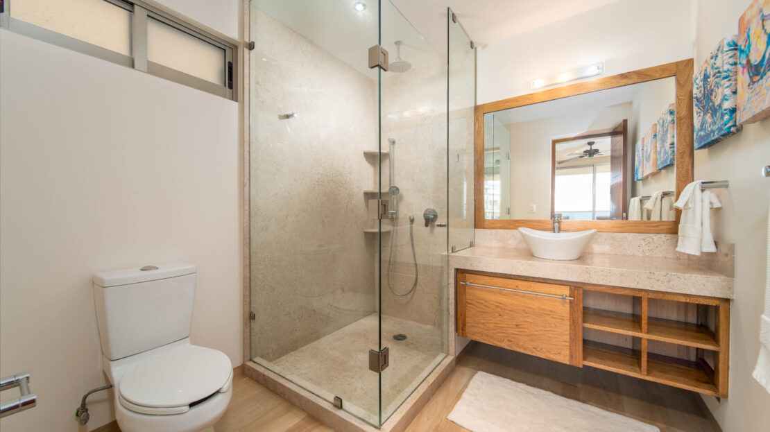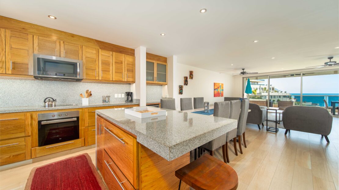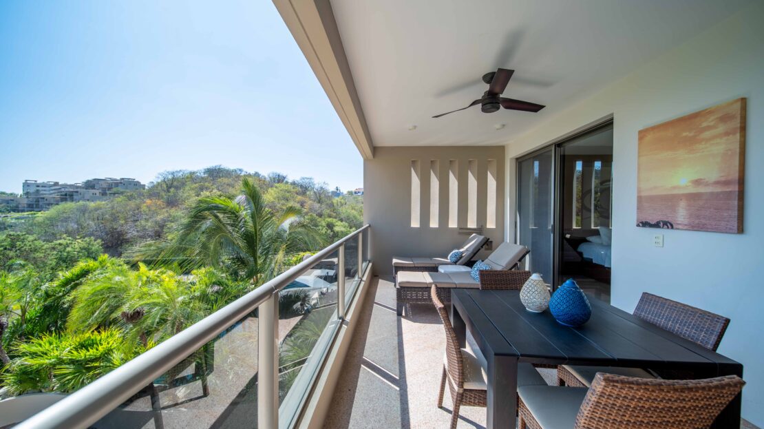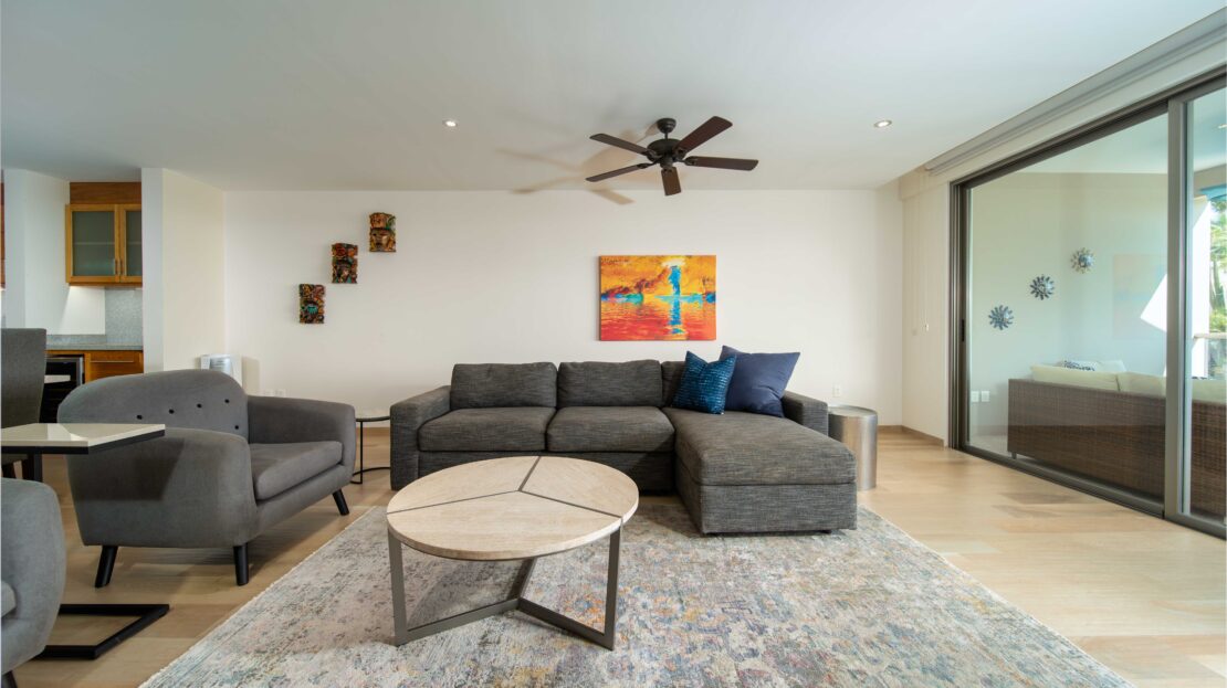 The condo’s interior is designed to blend modern sophistication with comfort. Expansive windows flood the open-concept living space with natural light, creating a seamless flow between the living, dining, and kitchen areas. High-end finishes and stylish furnishings enhance the sense of luxury, while a private terrace provides the perfect space to unwind and take in the tropical surroundings.