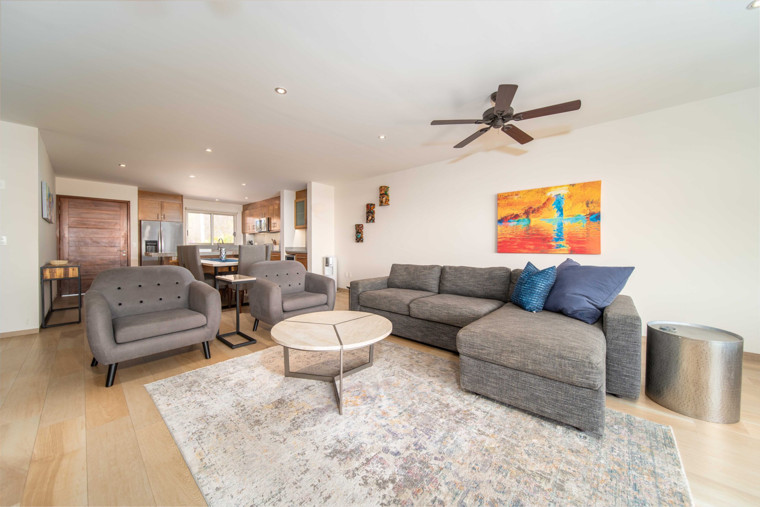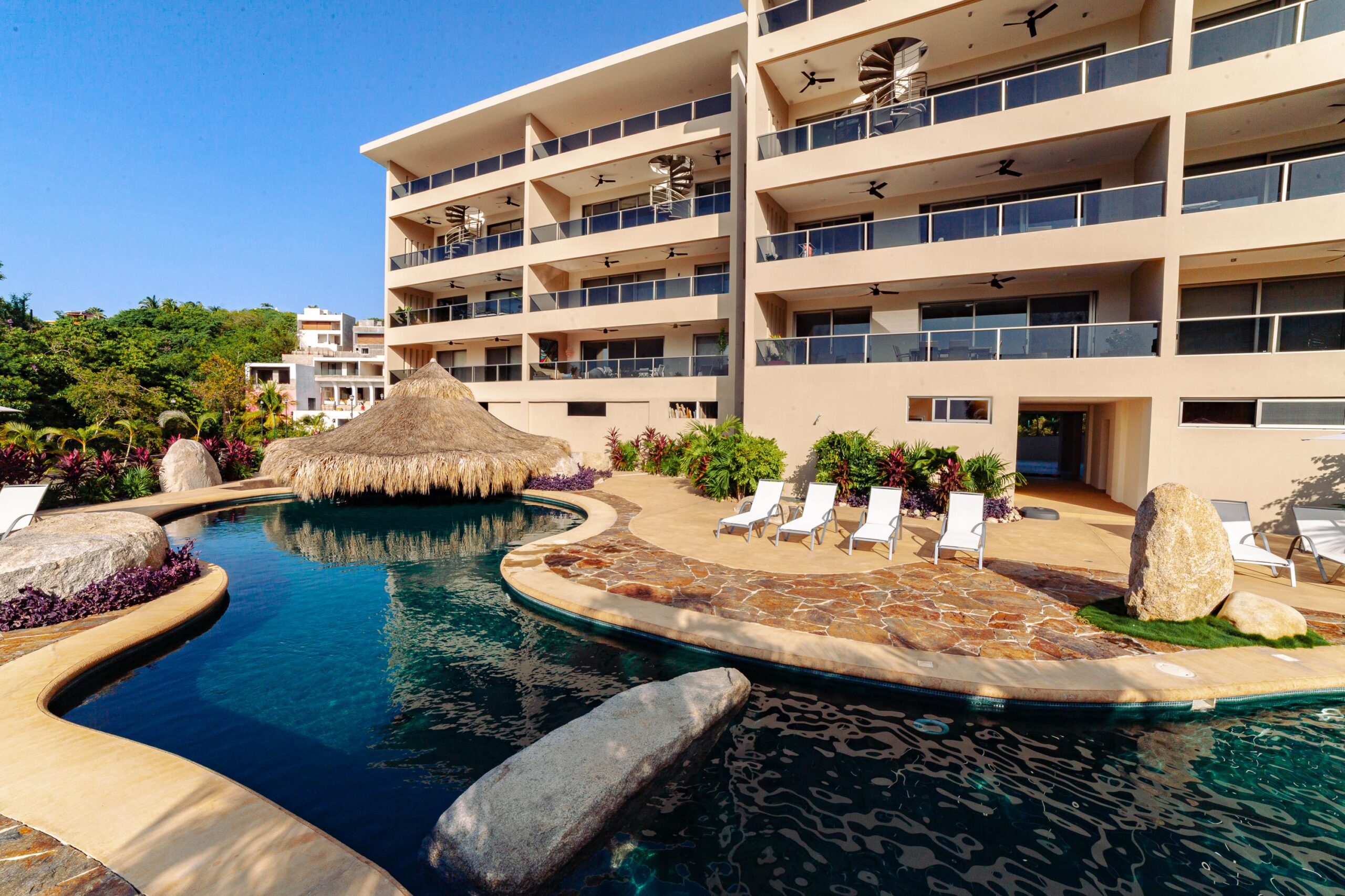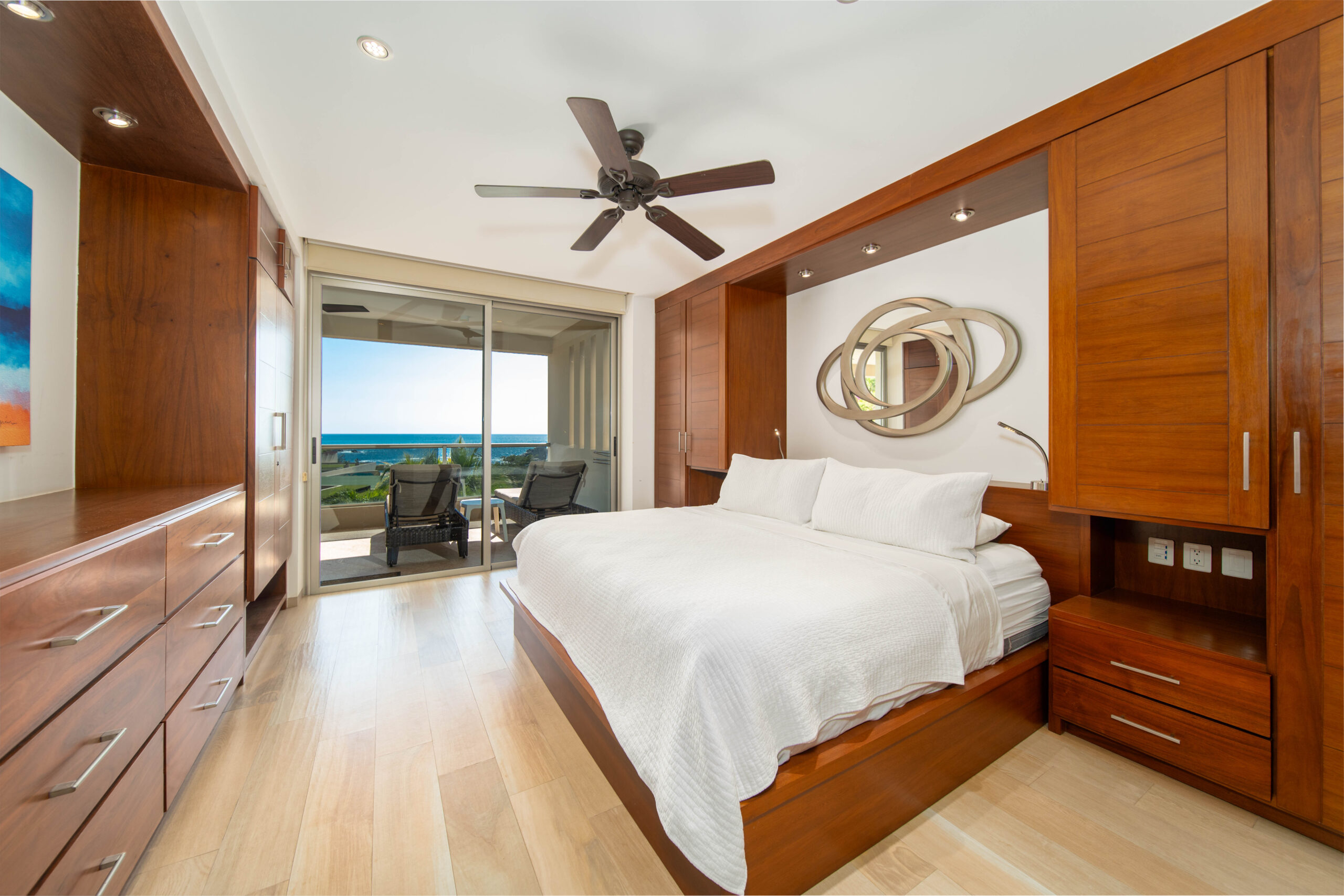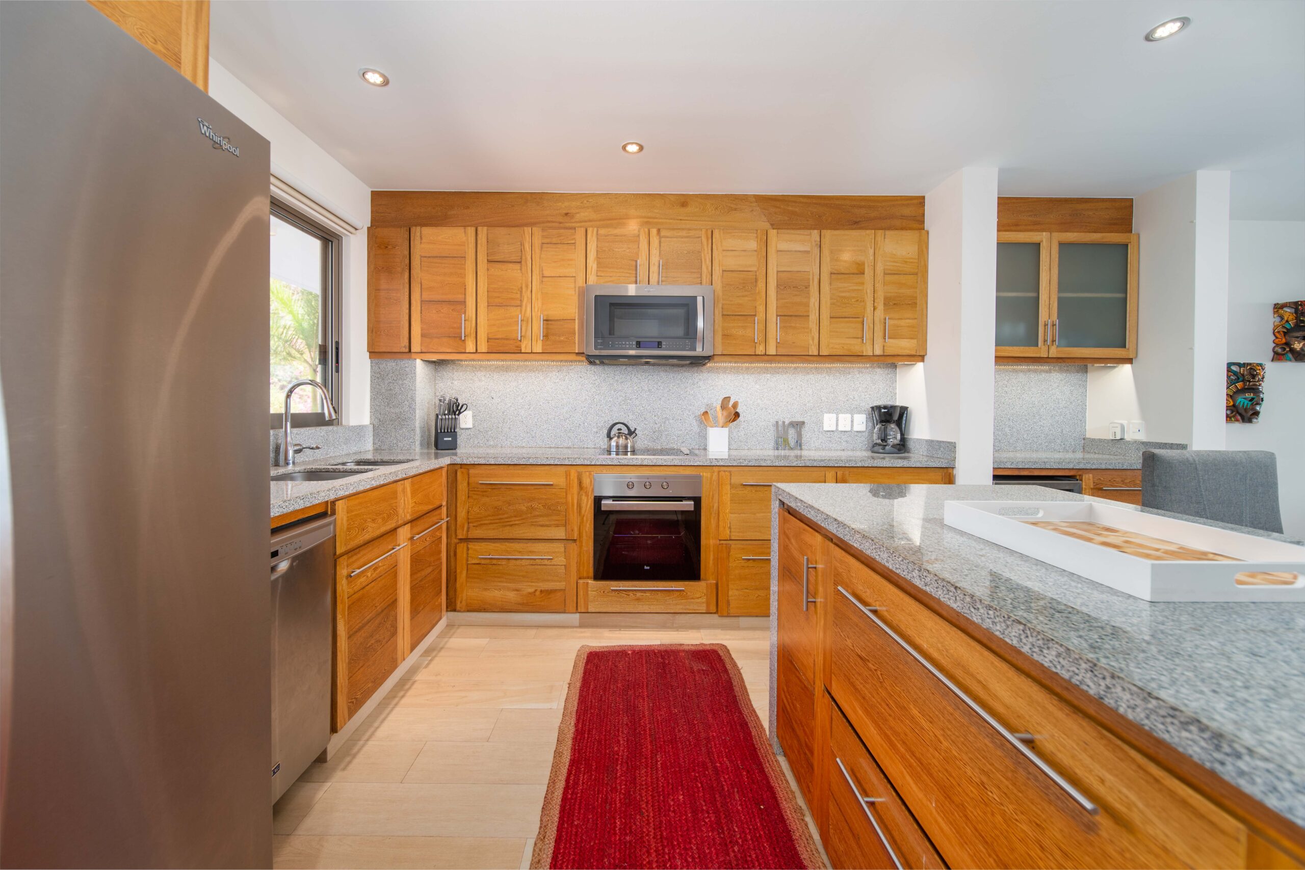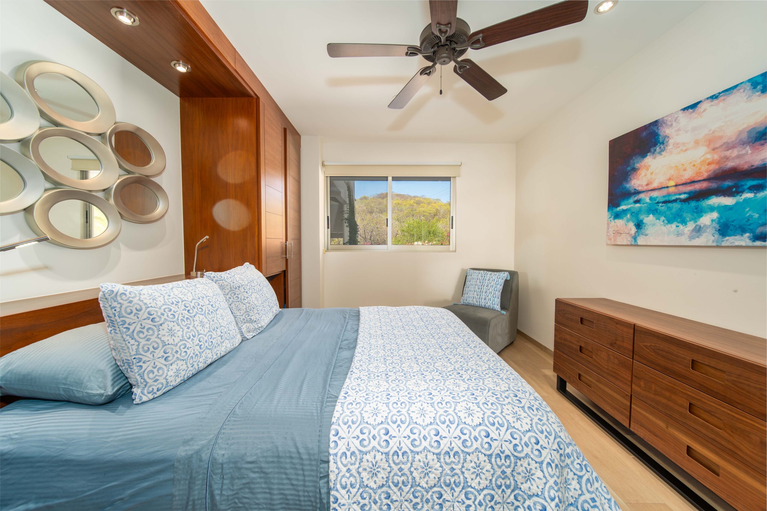 The condo’s interior is designed to blend modern sophistication with comfort. Expansive windows flood the open-concept living space with natural light, creating a seamless flow between the living, dining, and kitchen areas. High-end finishes and stylish furnishings enhance the sense of luxury, while a private terrace provides the perfect space to unwind and take in the tropical surroundings.