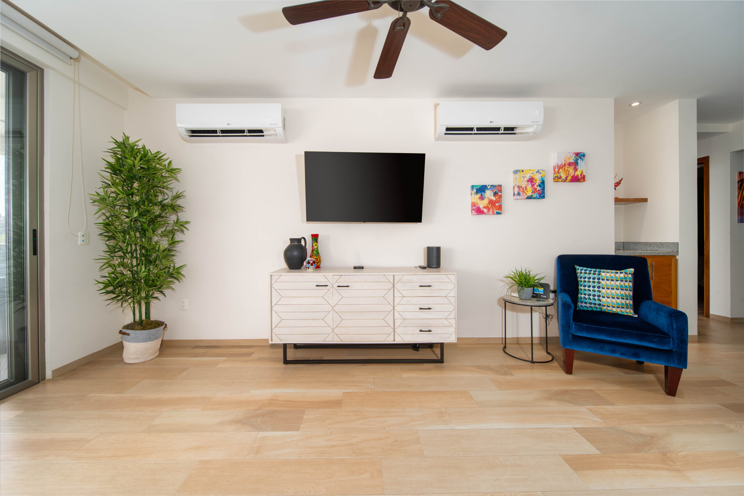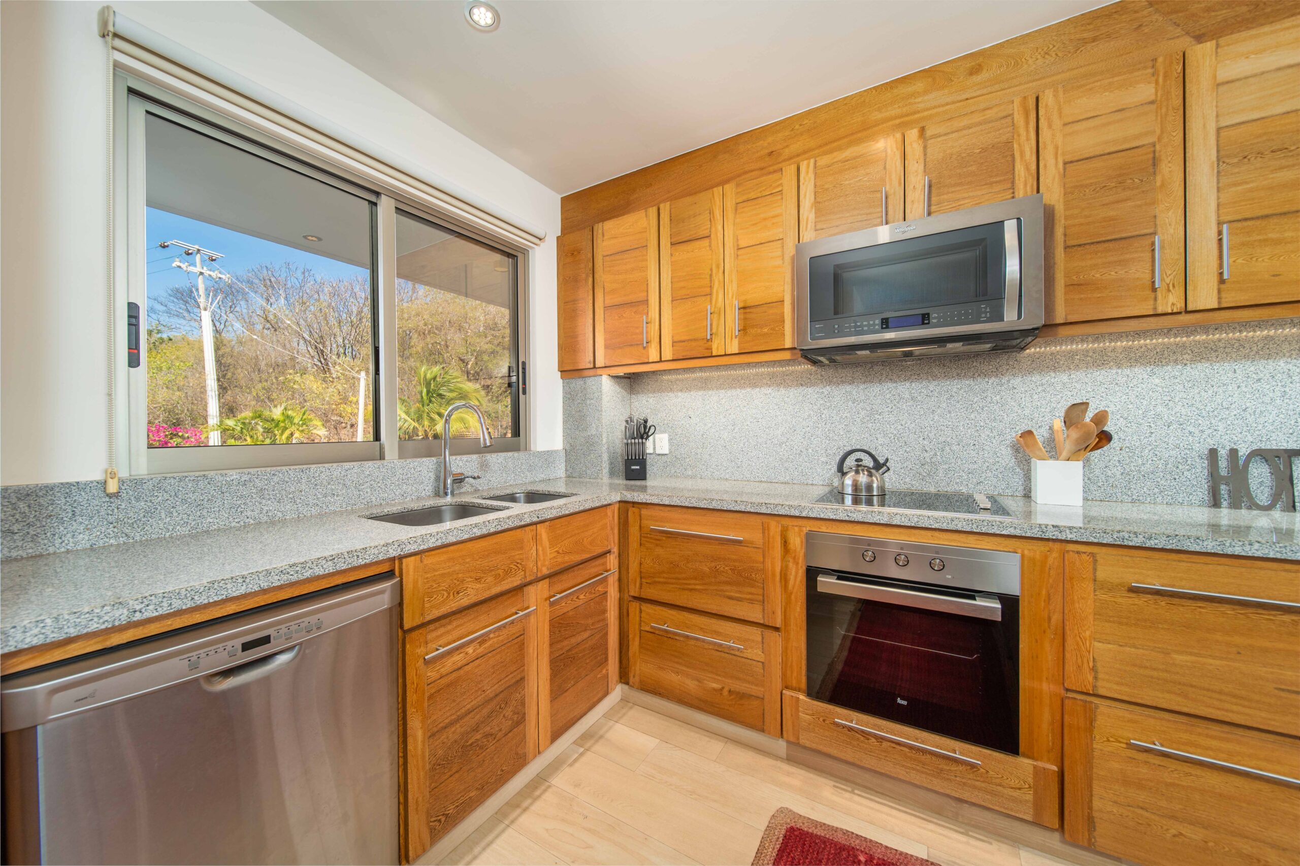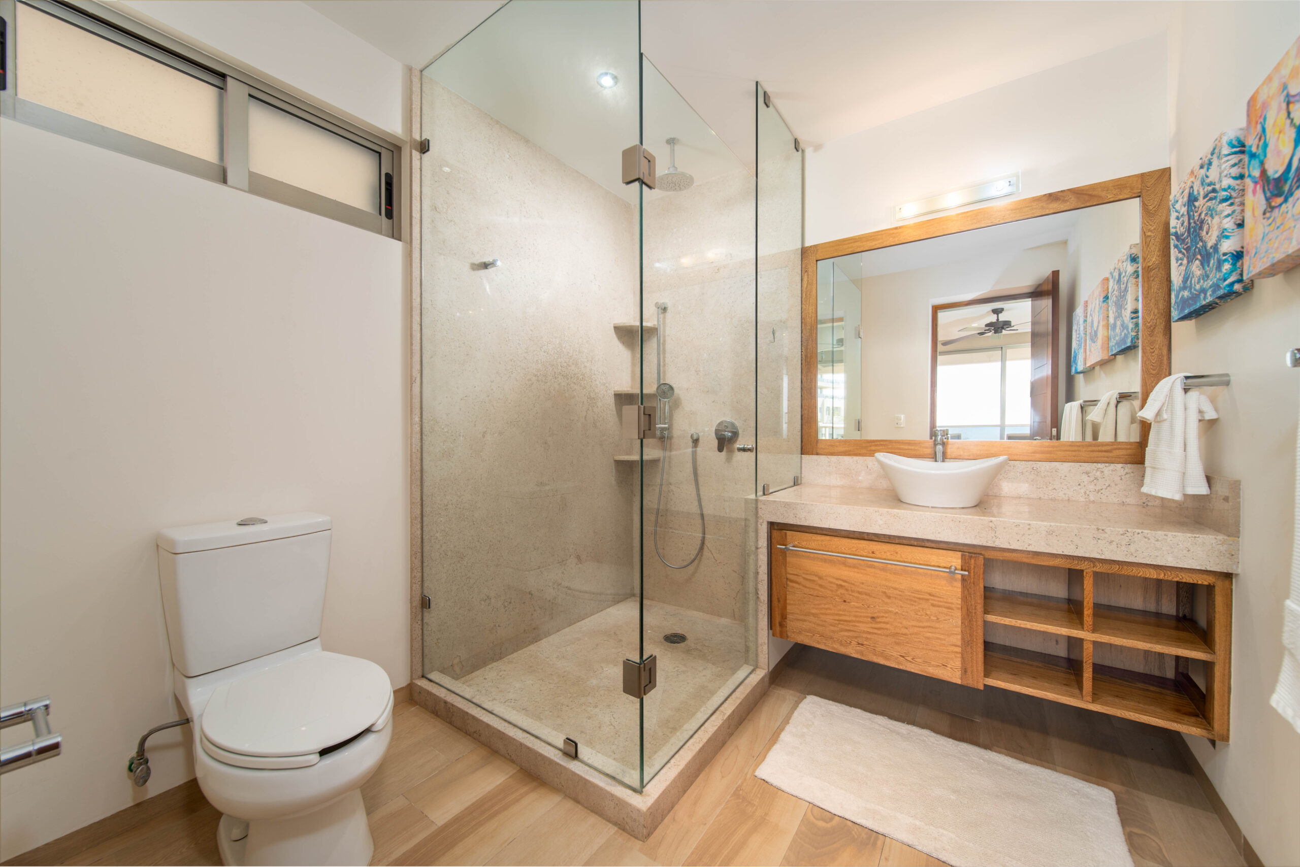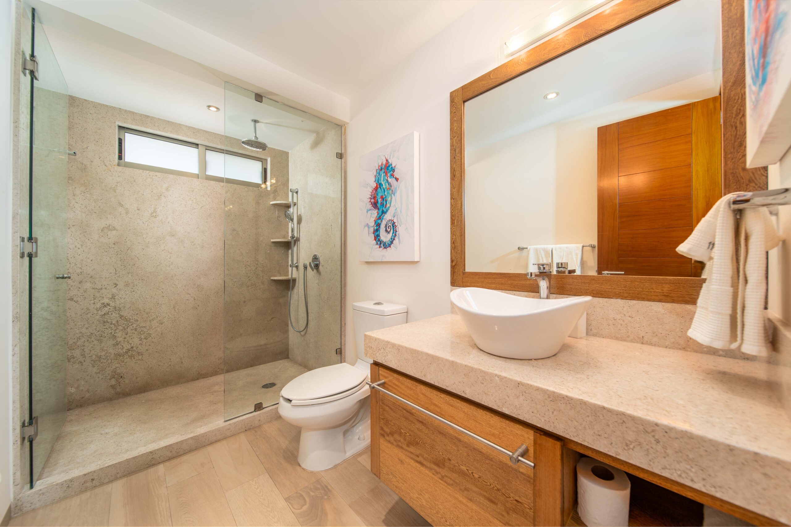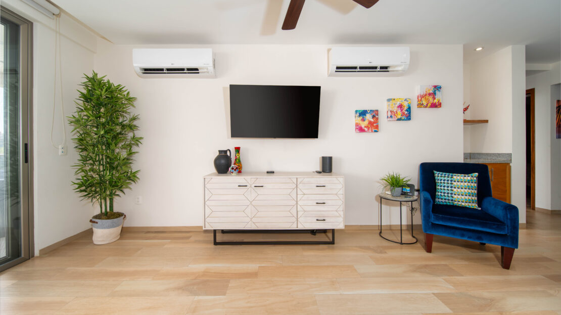 The condo’s interior is designed to blend modern sophistication with comfort. Expansive windows flood the open-concept living space with natural light, creating a seamless flow between the living, dining, and kitchen areas. High-end finishes and stylish furnishings enhance the sense of luxury, while a private terrace provides the perfect space to unwind and take in the tropical surroundings.