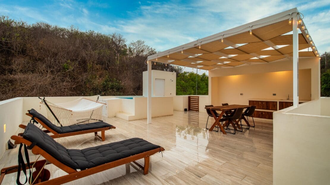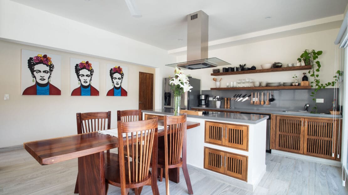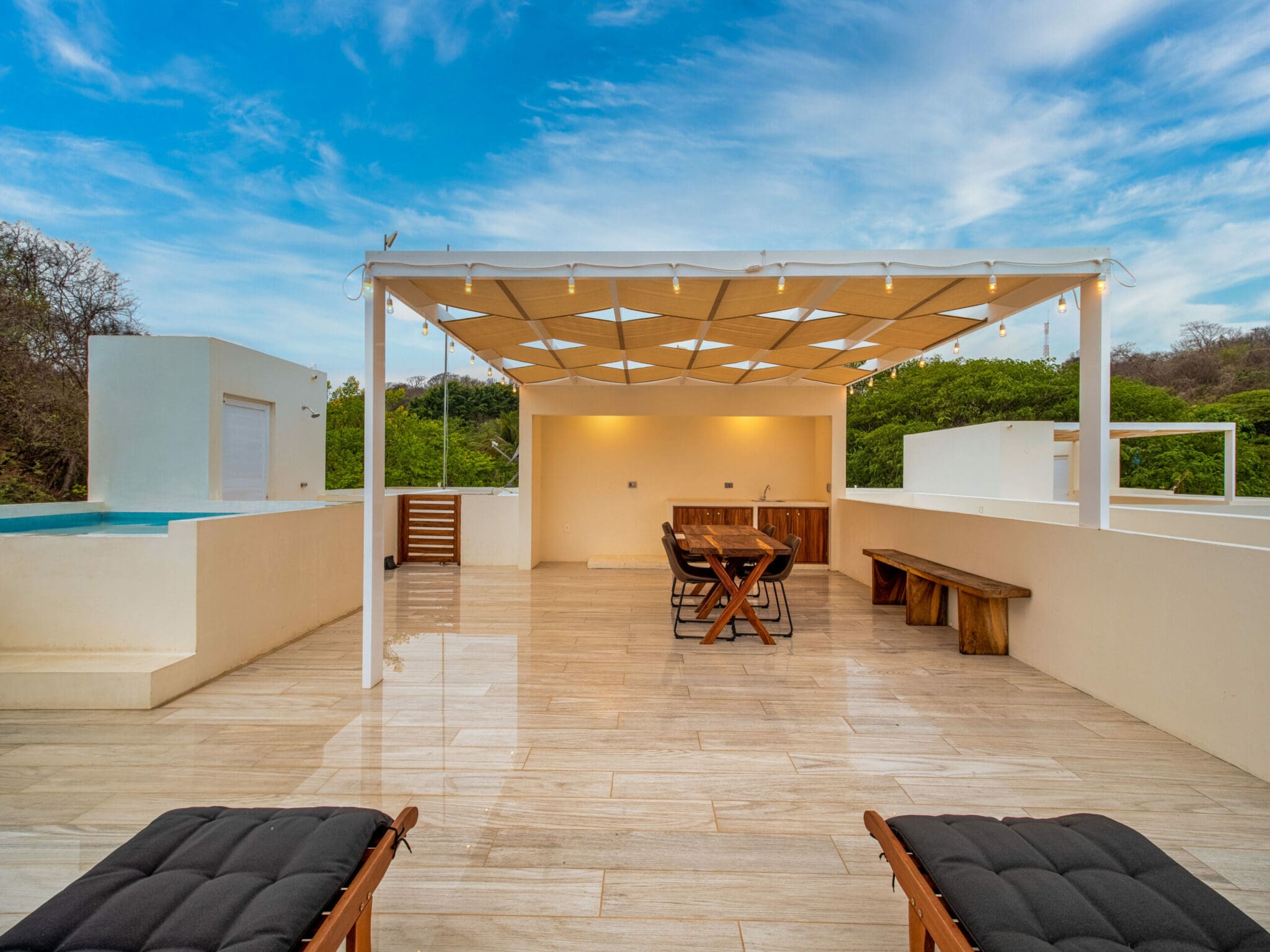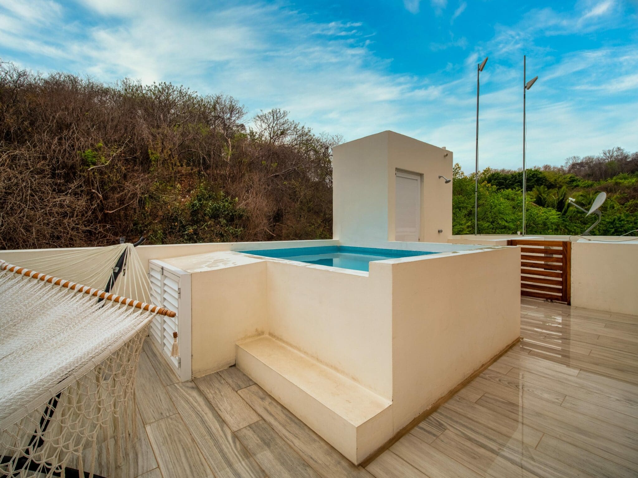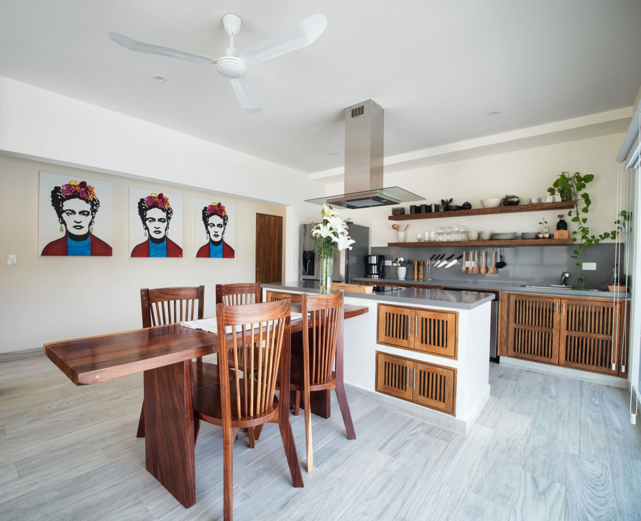 Relaxation awaits by the common area pool or on your private rooftop terrace, complete with a plunge pool and lounging sundeck ideal for entertaining guests. Adorned with beautiful Huanacaxtle wood finishes, the fully equipped kitchen with quartz countertops provides the perfect setting for culinary adventures.