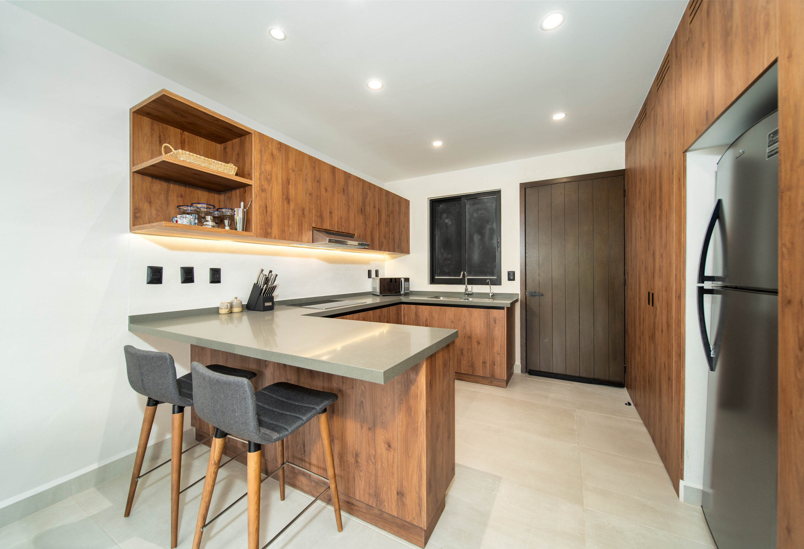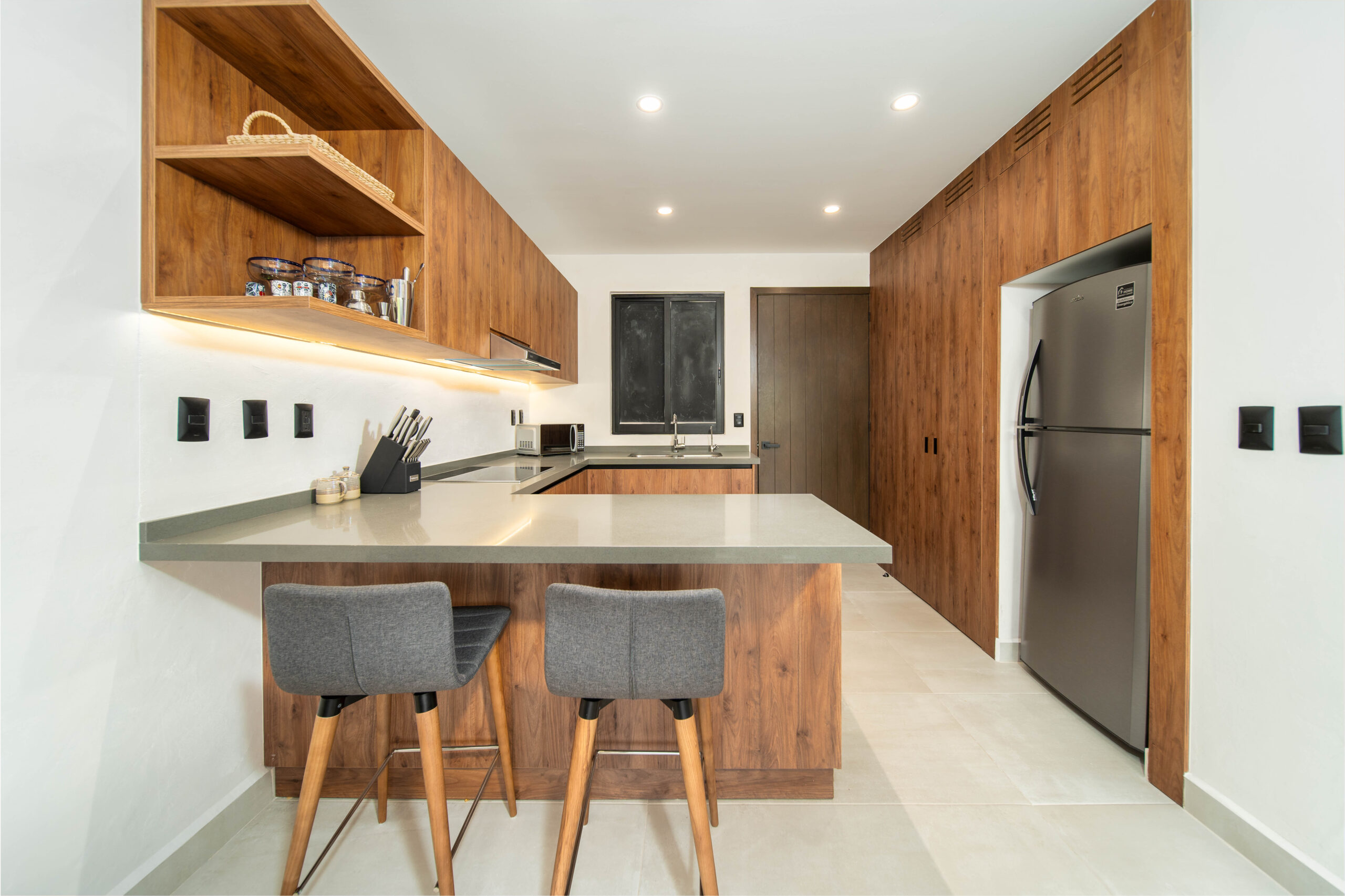 With 645 Ft2 of thoughtfully designed interior space, the studio layout feels open, bright, and functional. The kitchen showcases quartz countertops paired with elegant Macuil wood cabinets and doors, creating a warm yet contemporary atmosphere. The terrace offers a mountain view and allows you to enjoy the outdoors all day without direct sun. A combo washer/dryer unit adds everyday convenience whether used as a personal retreat, full-time residence, or rental property.