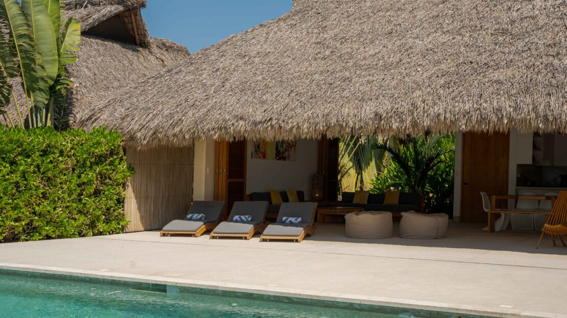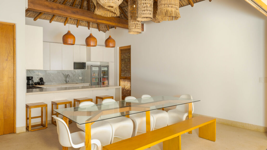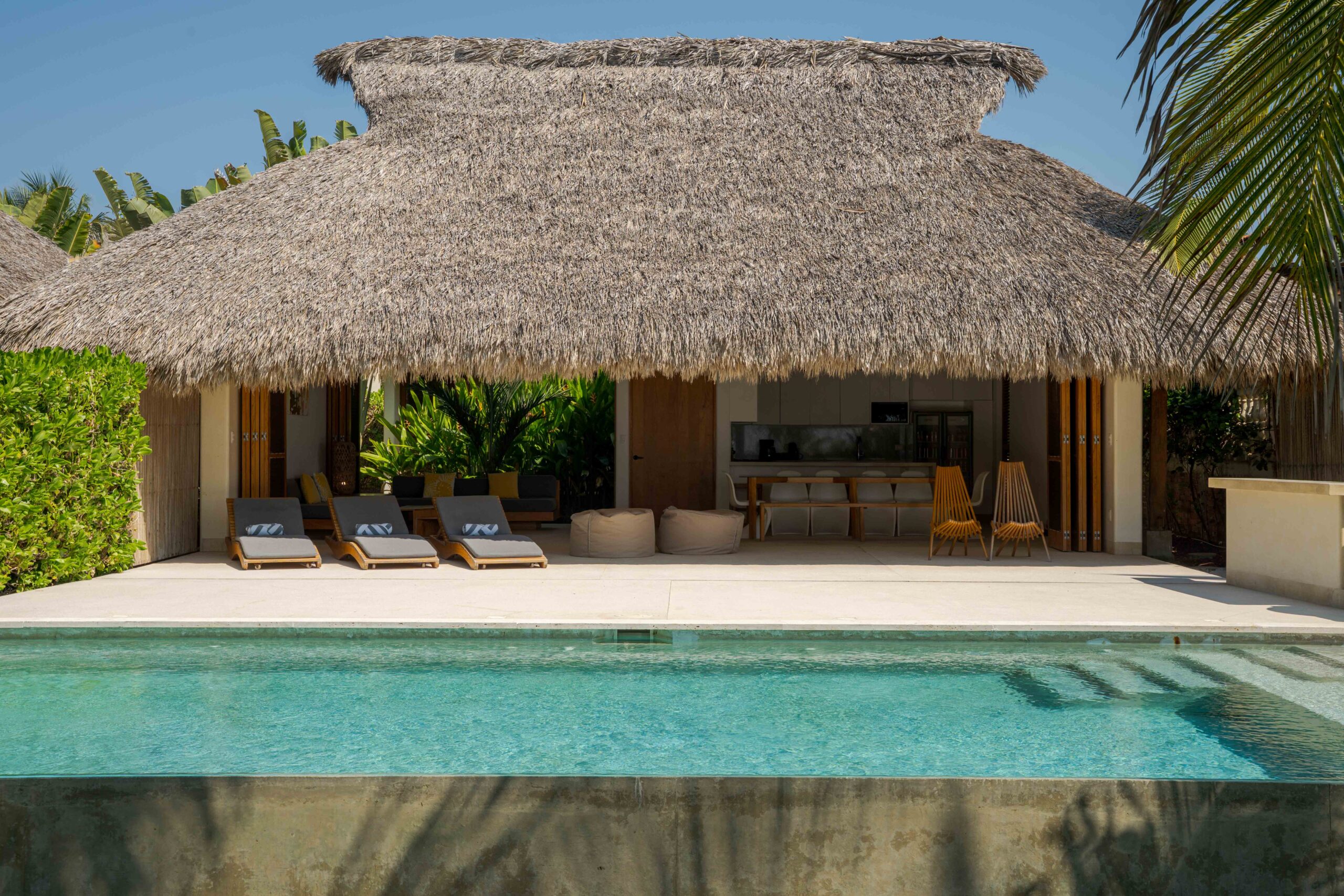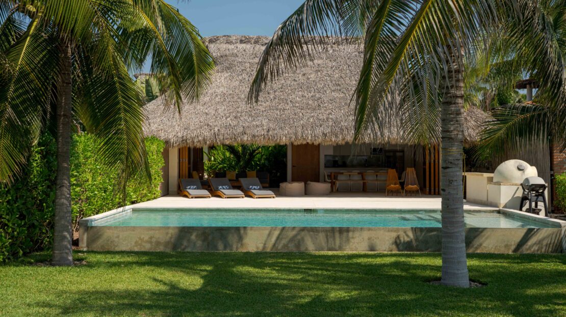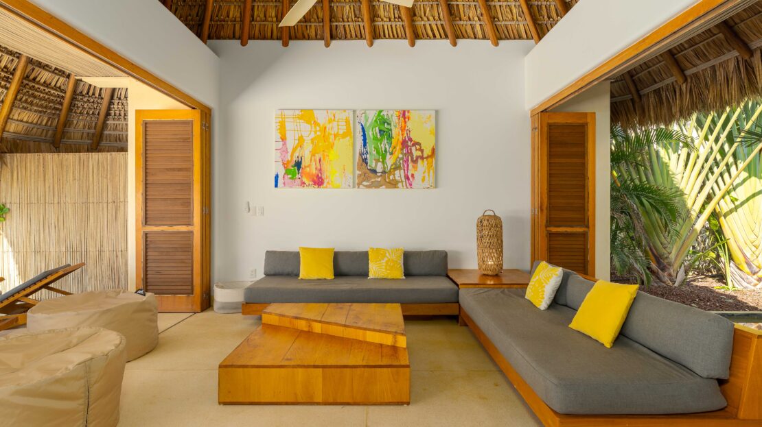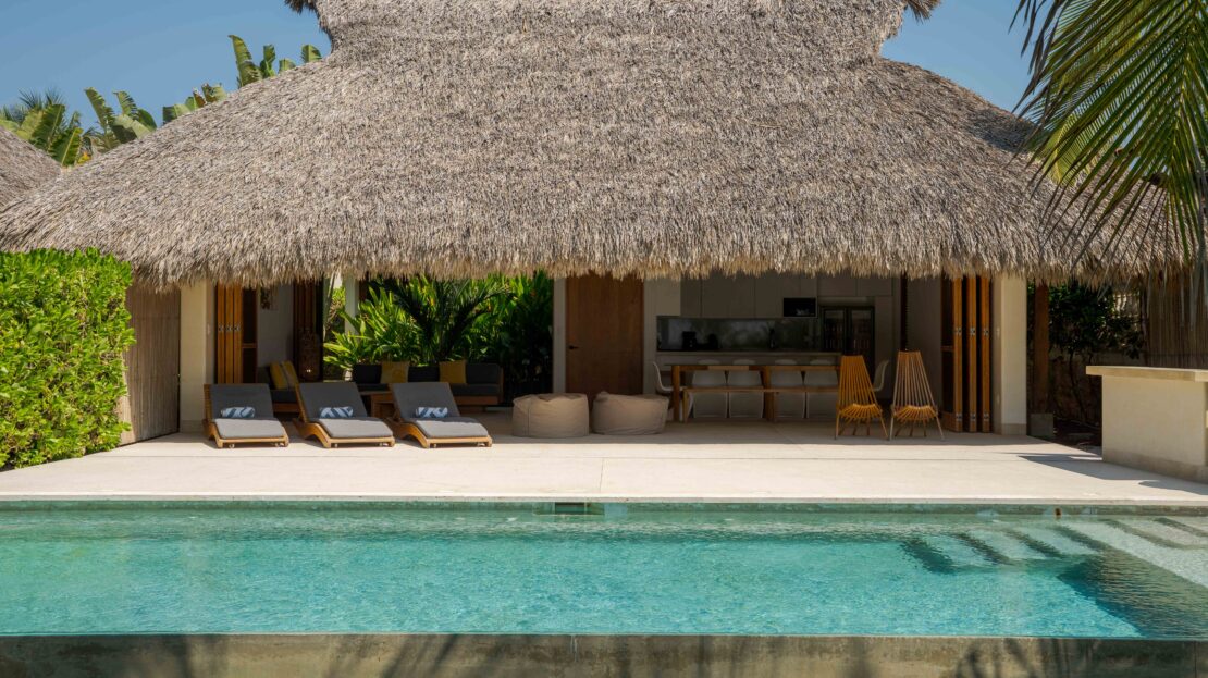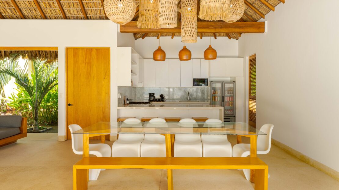 Designed with an effortless coastal elegance, the villa embraces an open-concept layout where indoor and outdoor living merge seamlessly. A soaring palapa ceiling anchors the main living space, filling the home with warmth, natural textures, and a sense of serene sophistication. Sunlight filters through each space, enhancing the fluid connection to the outdoors and drawing your gaze toward the shimmering water beyond.