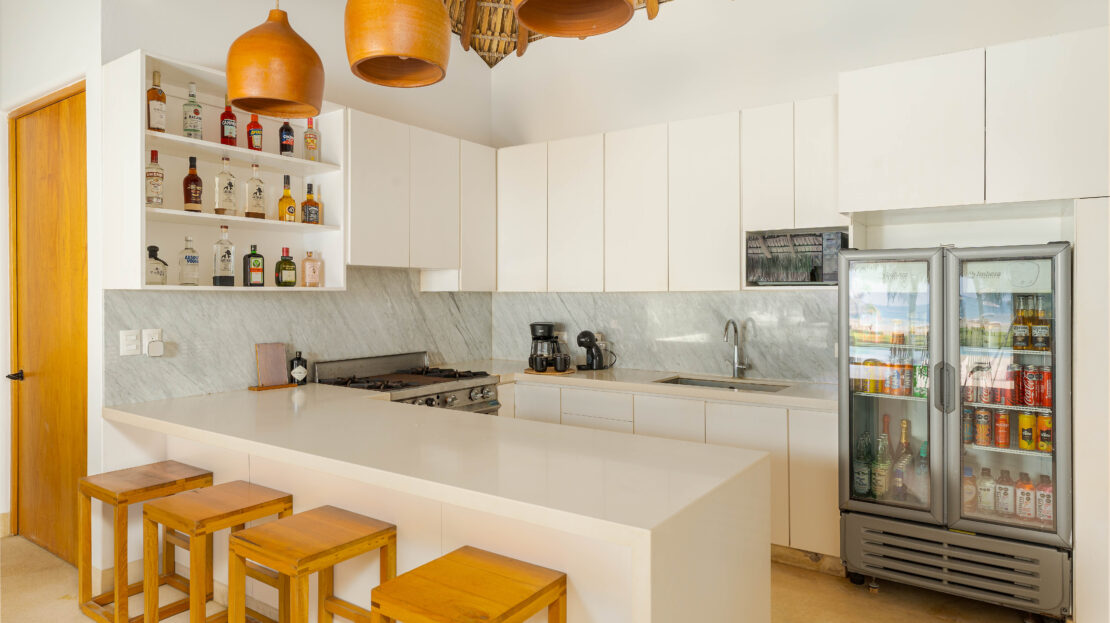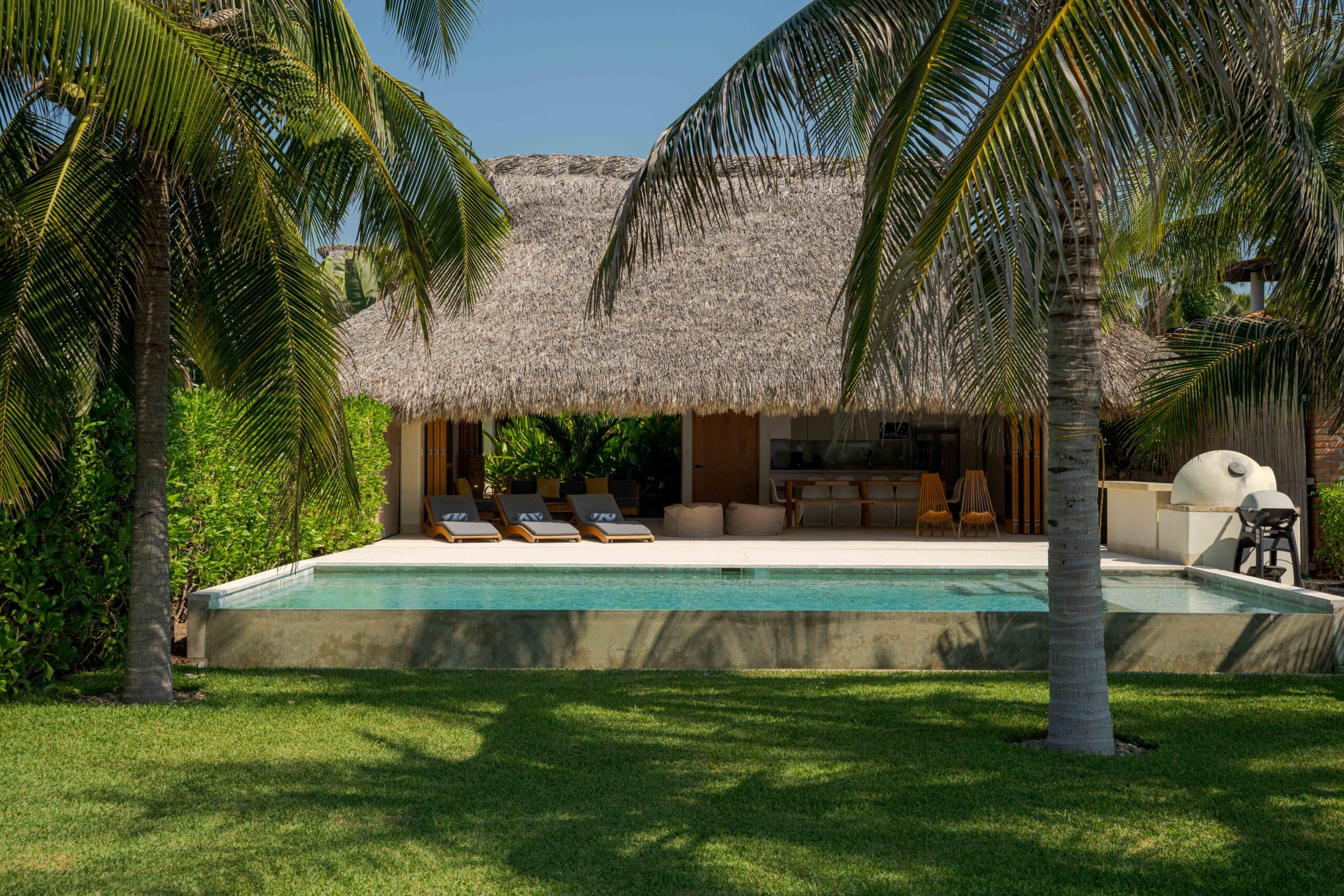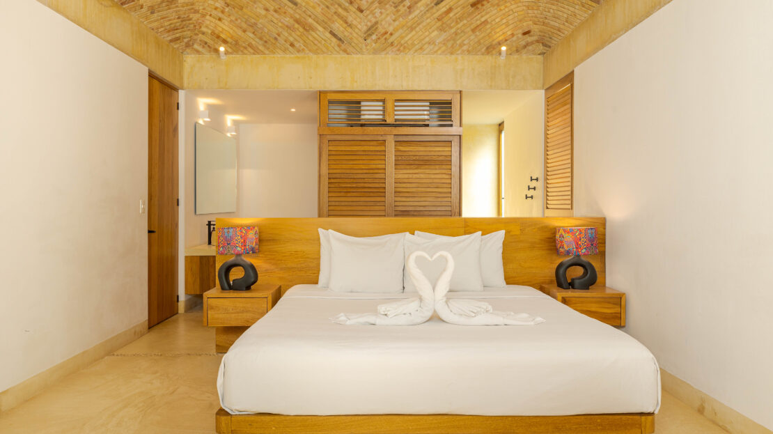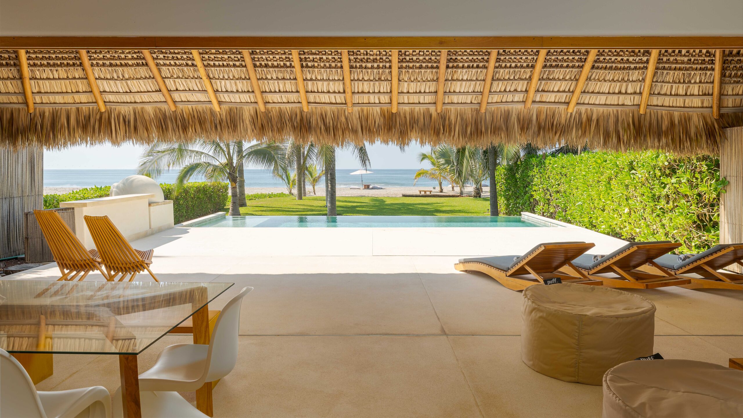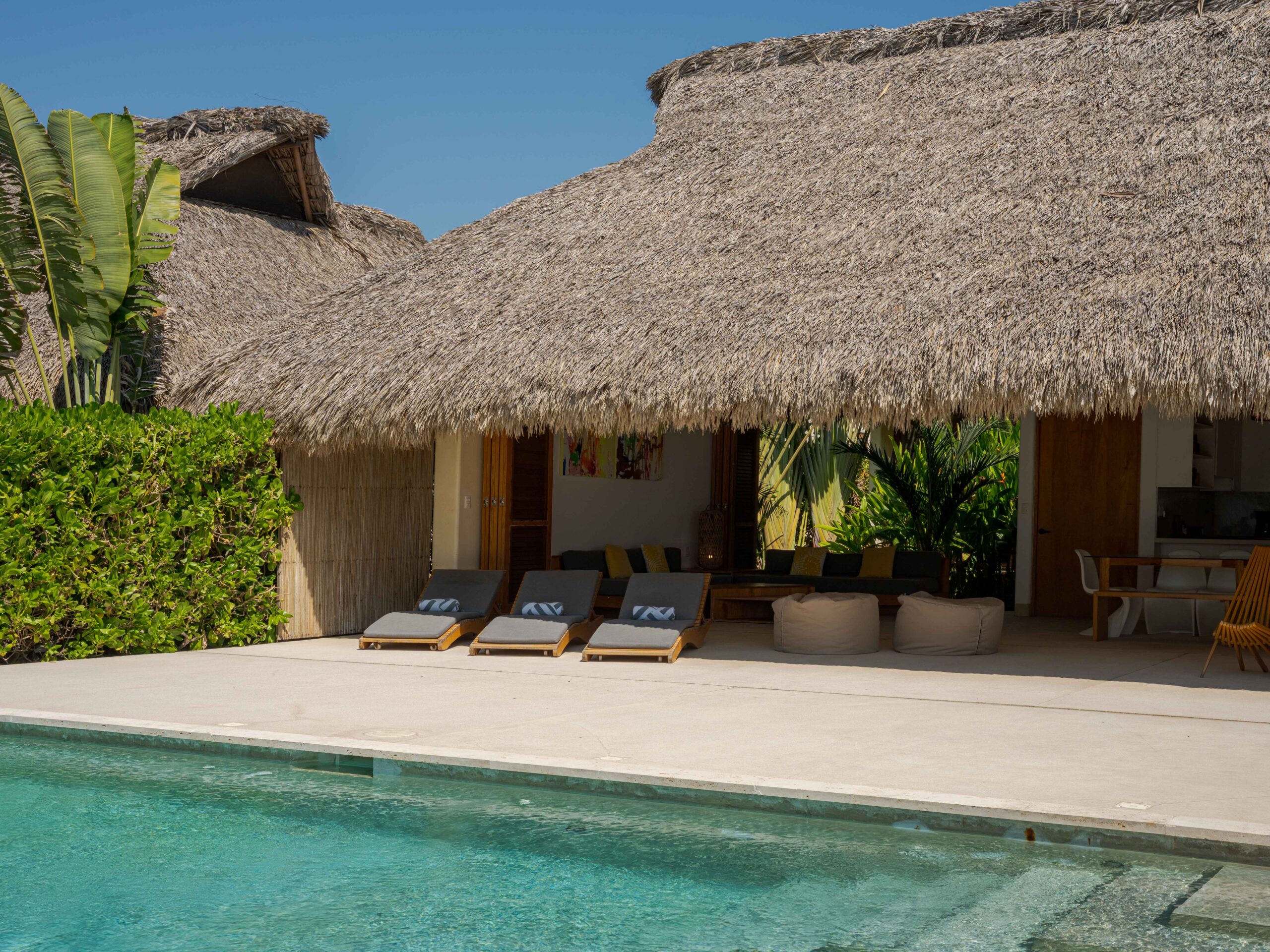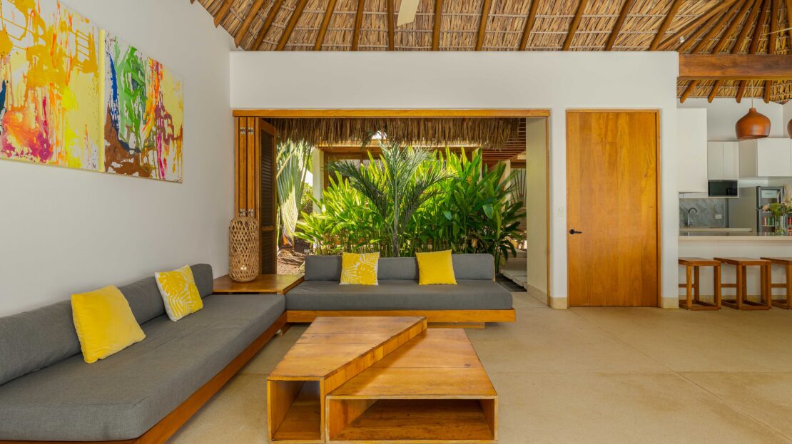 Designed with an effortless coastal elegance, the villa embraces an open-concept layout where indoor and outdoor living merge seamlessly. A soaring palapa ceiling anchors the main living space, filling the home with warmth, natural textures, and a sense of serene sophistication. Sunlight filters through each space, enhancing the fluid connection to the outdoors and drawing your gaze toward the shimmering water beyond.