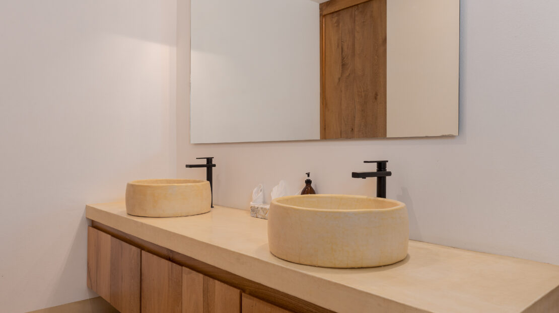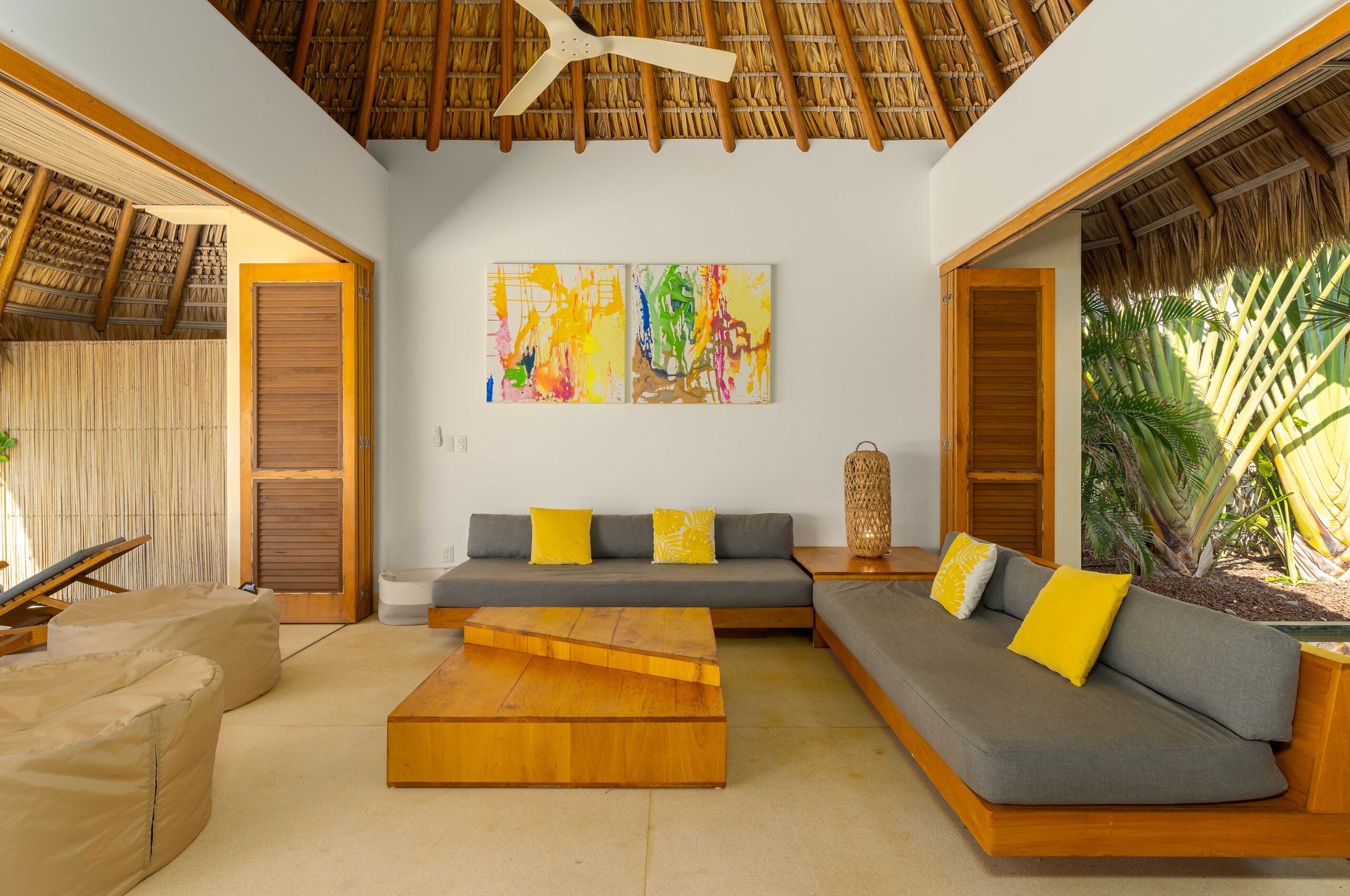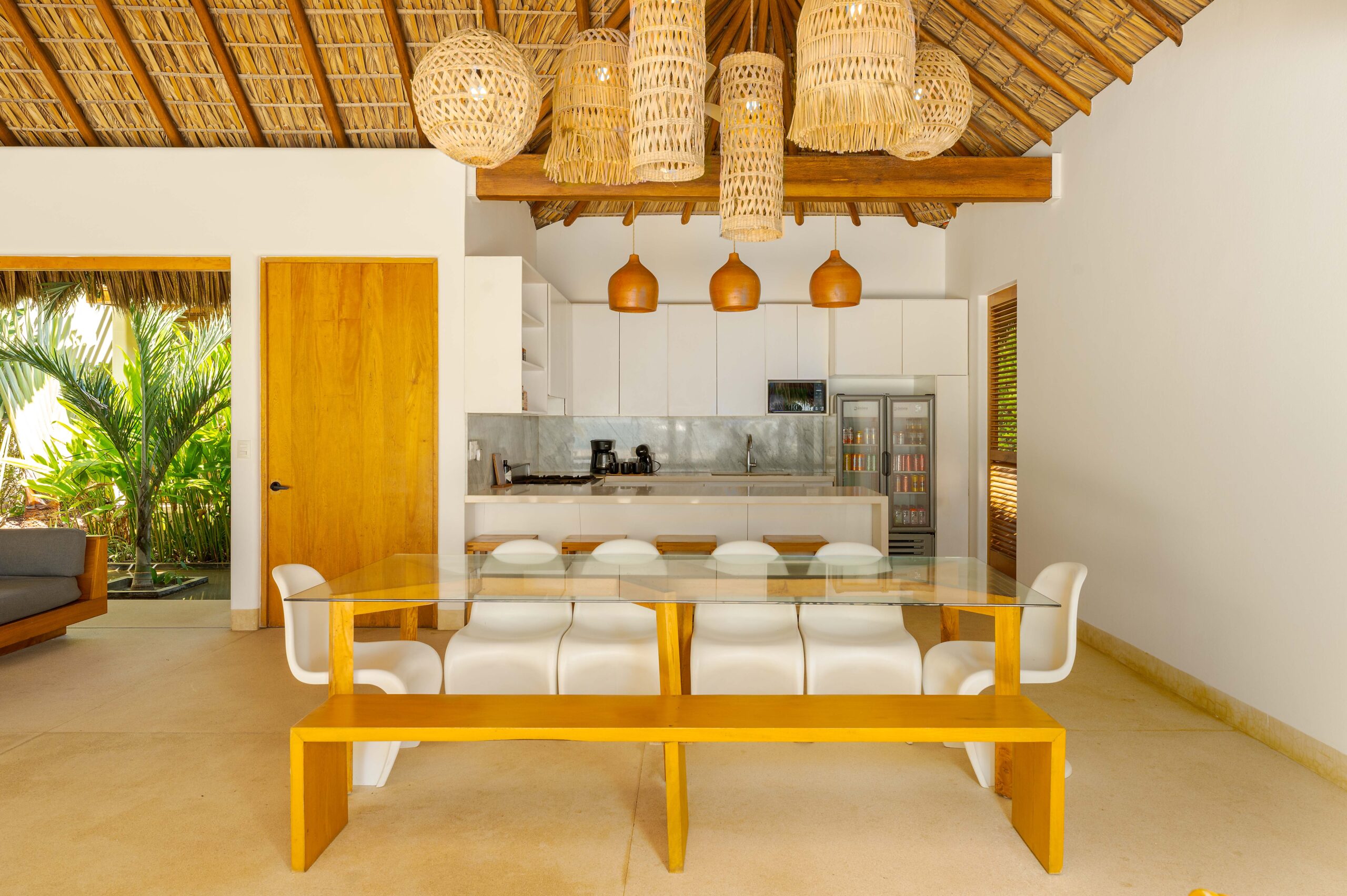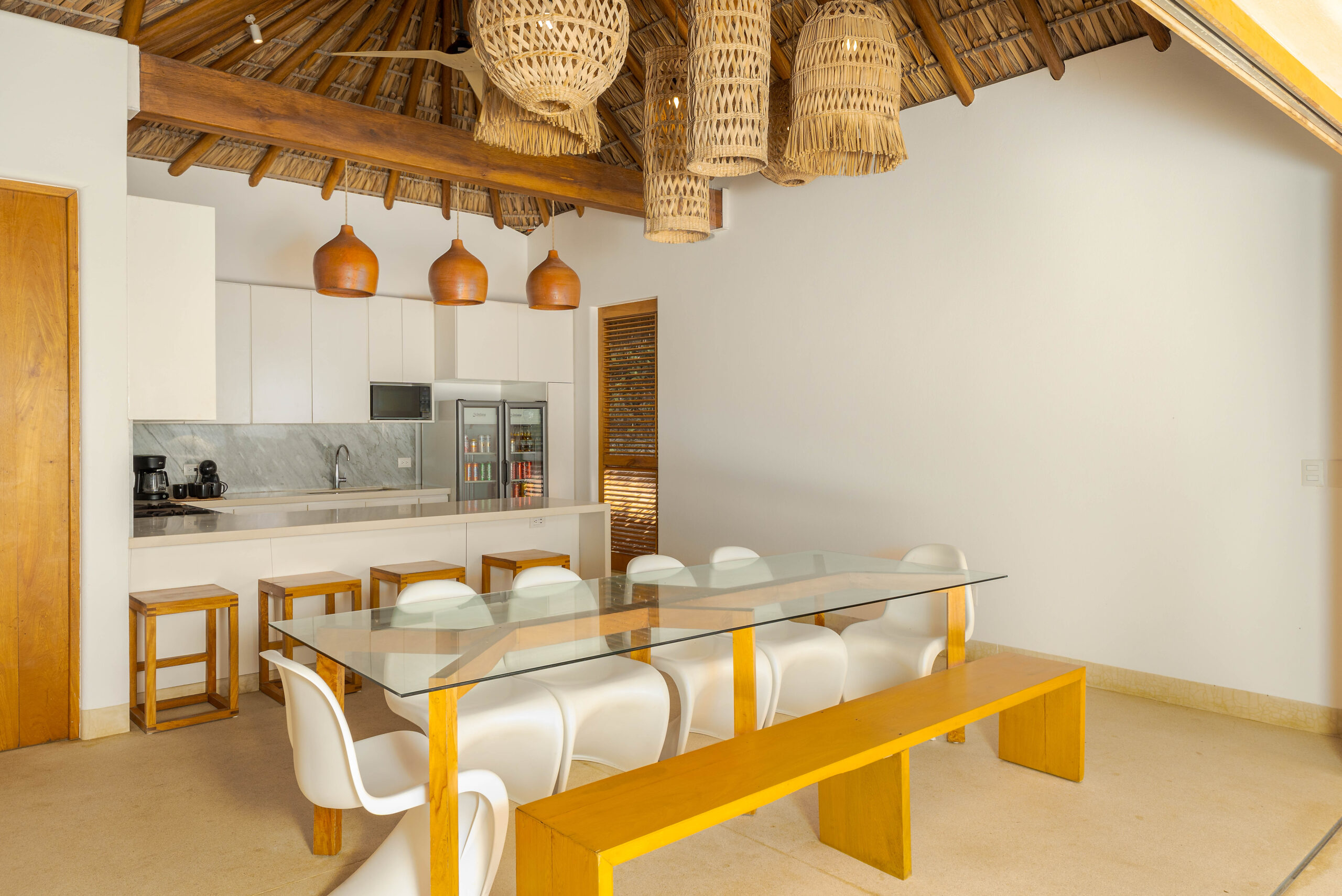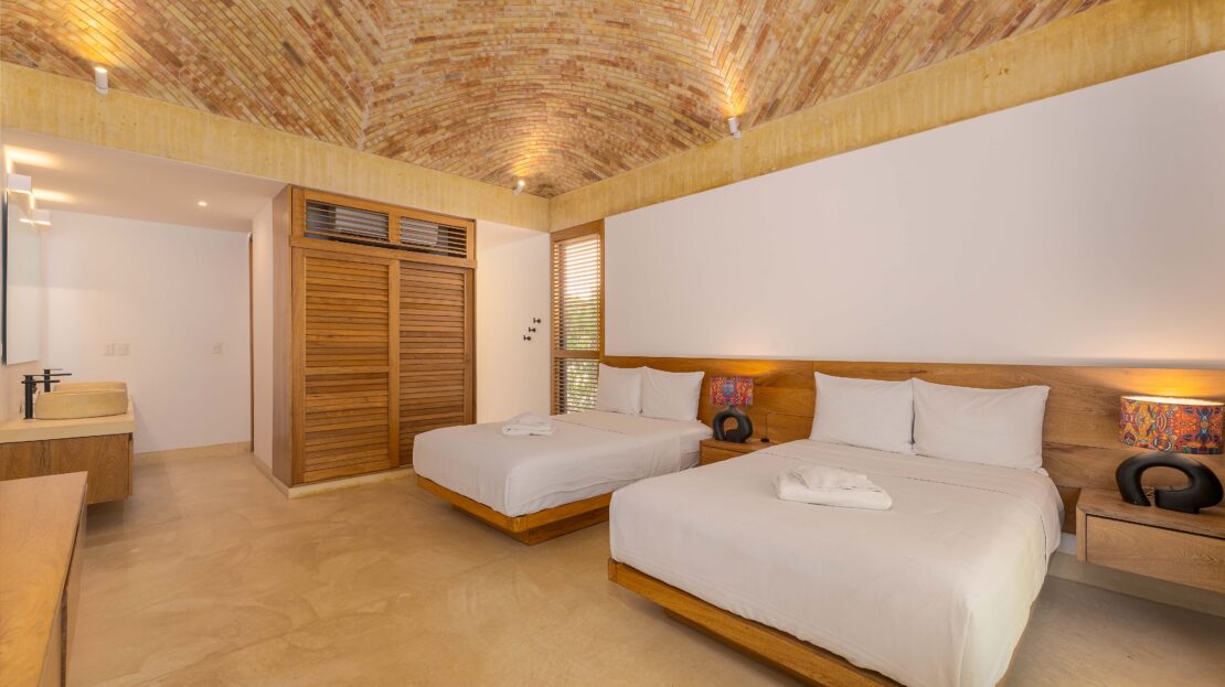 Designed with an effortless coastal elegance, the villa embraces an open-concept layout where indoor and outdoor living merge seamlessly. A soaring palapa ceiling anchors the main living space, filling the home with warmth, natural textures, and a sense of serene sophistication. Sunlight filters through each space, enhancing the fluid connection to the outdoors and drawing your gaze toward the shimmering water beyond.