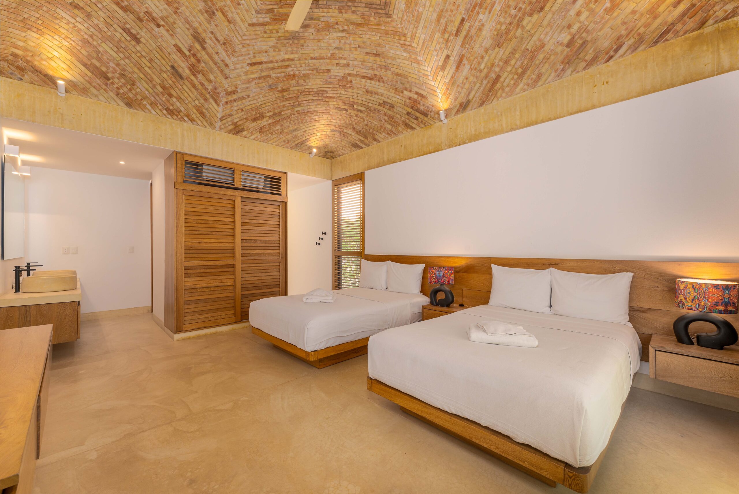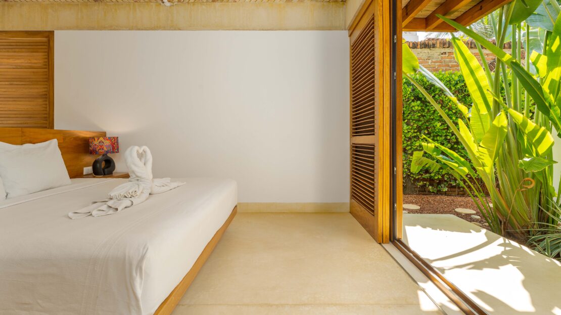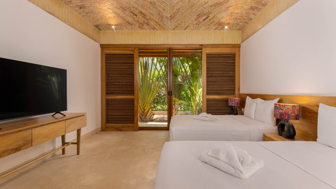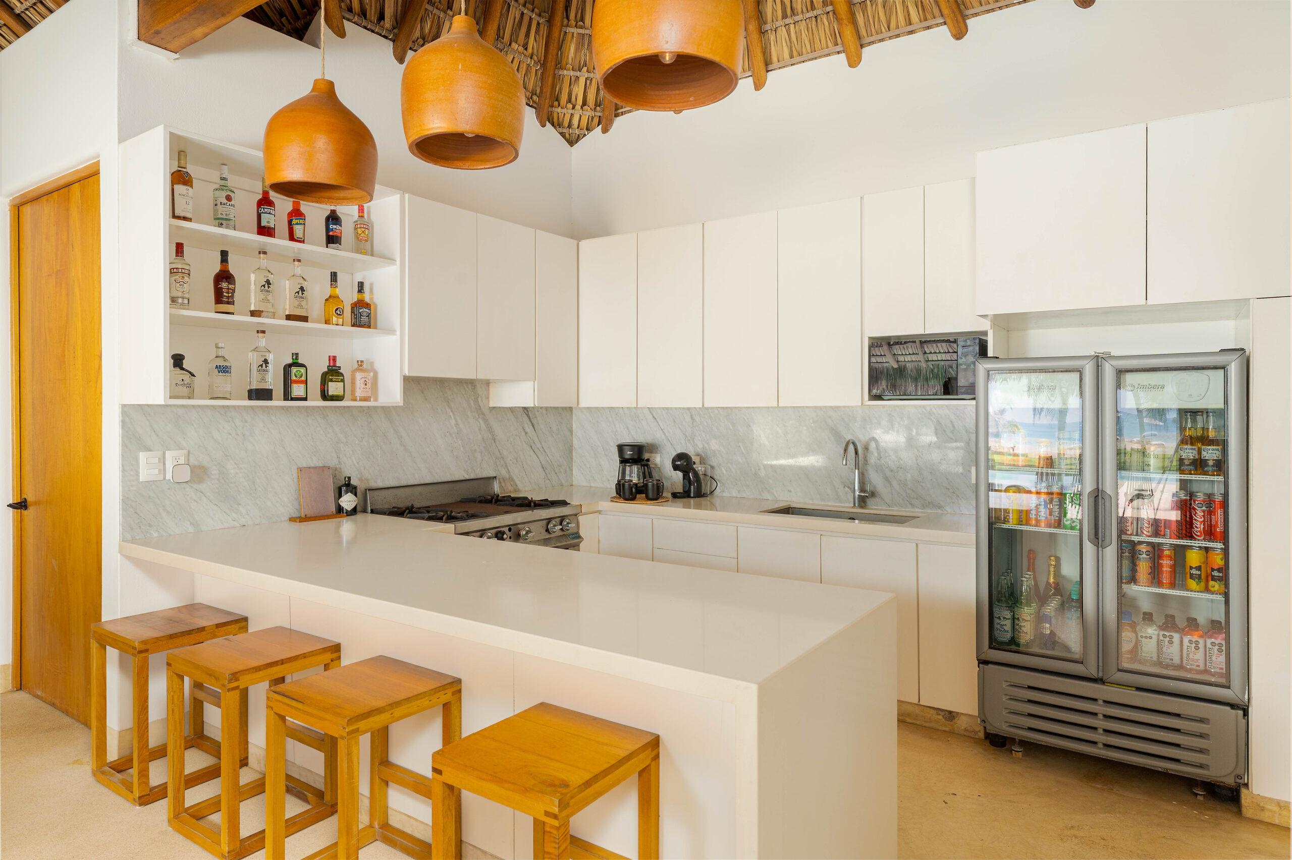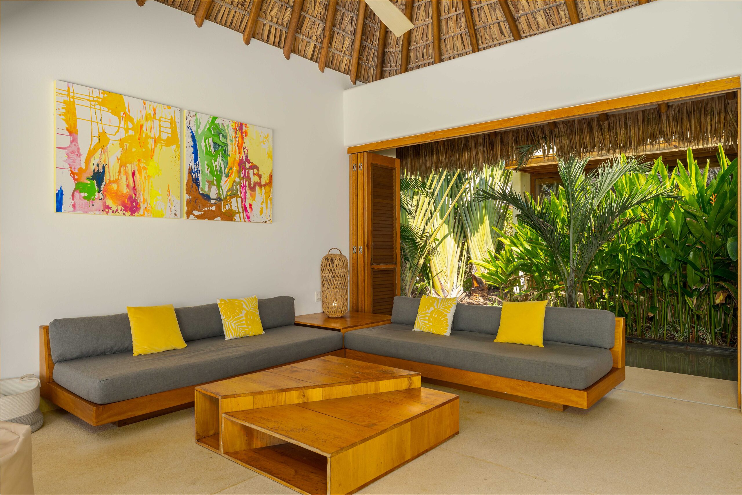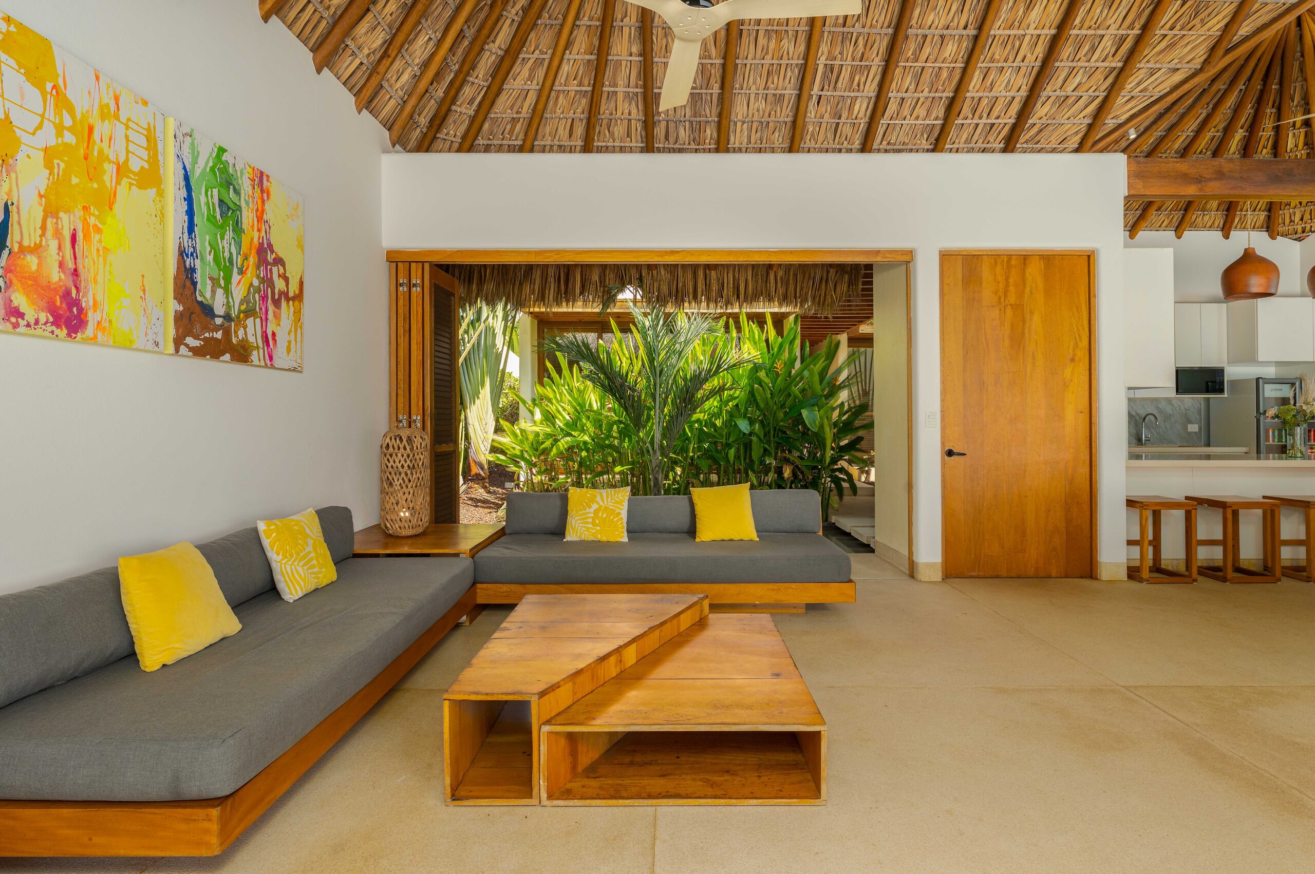 Designed with an effortless coastal elegance, the villa embraces an open-concept layout where indoor and outdoor living merge seamlessly. A soaring palapa ceiling anchors the main living space, filling the home with warmth, natural textures, and a sense of serene sophistication. Sunlight filters through each space, enhancing the fluid connection to the outdoors and drawing your gaze toward the shimmering water beyond.