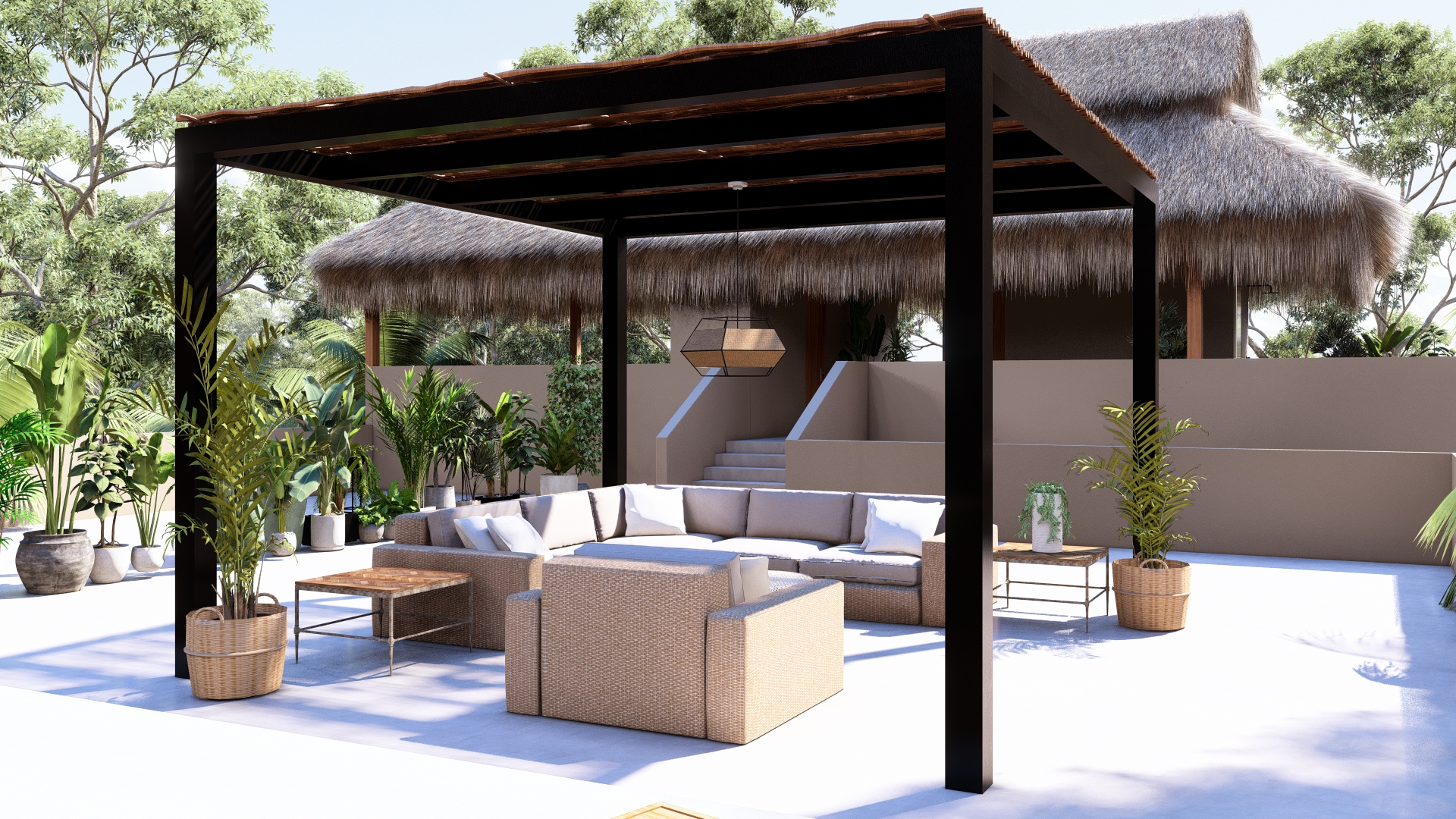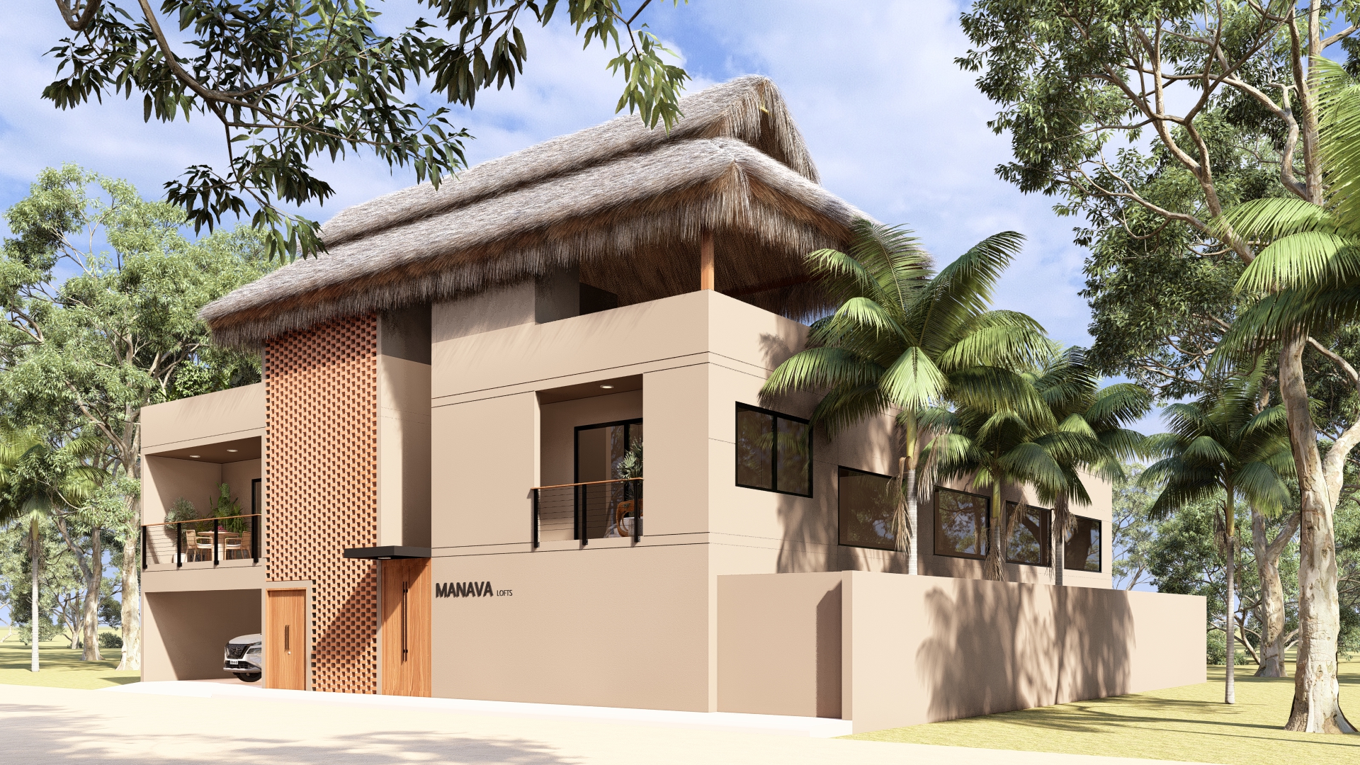 The Manava Duplex Penthouse offers an elevated living experience that perfectly captures the relaxed coastal elegance of Puerto Escondido. Spanning 556 Ft2, this one-bedroom, one-bath residence is distributed over two levels, featuring an open-concept lower floor with a bright living and kitchen area, and an upper floor that opens to a private rooftop terrace with a palapa and partial ocean view. Designed with attention to detail, the interiors combine bohemian textures, natural light, and timeless materials like polished terrazzo and soft gray concrete.