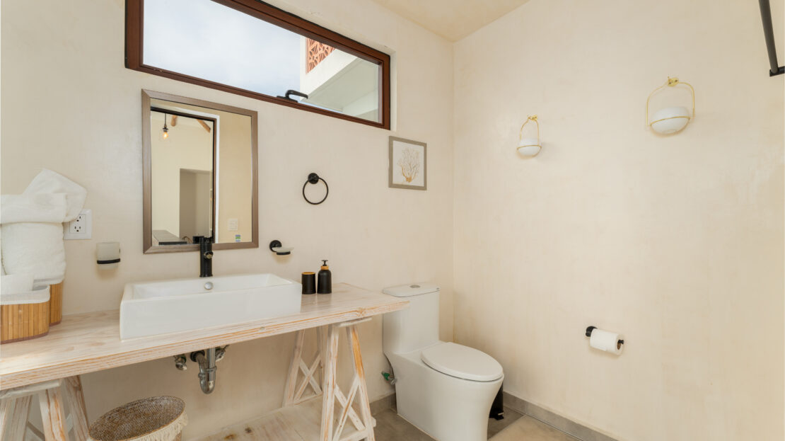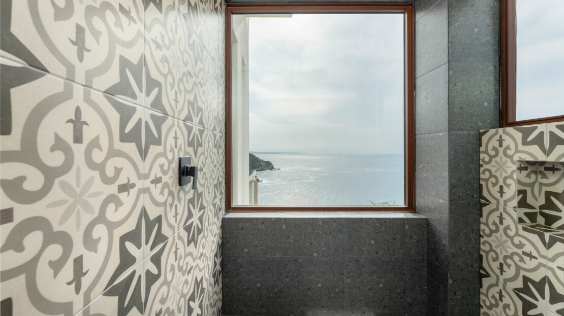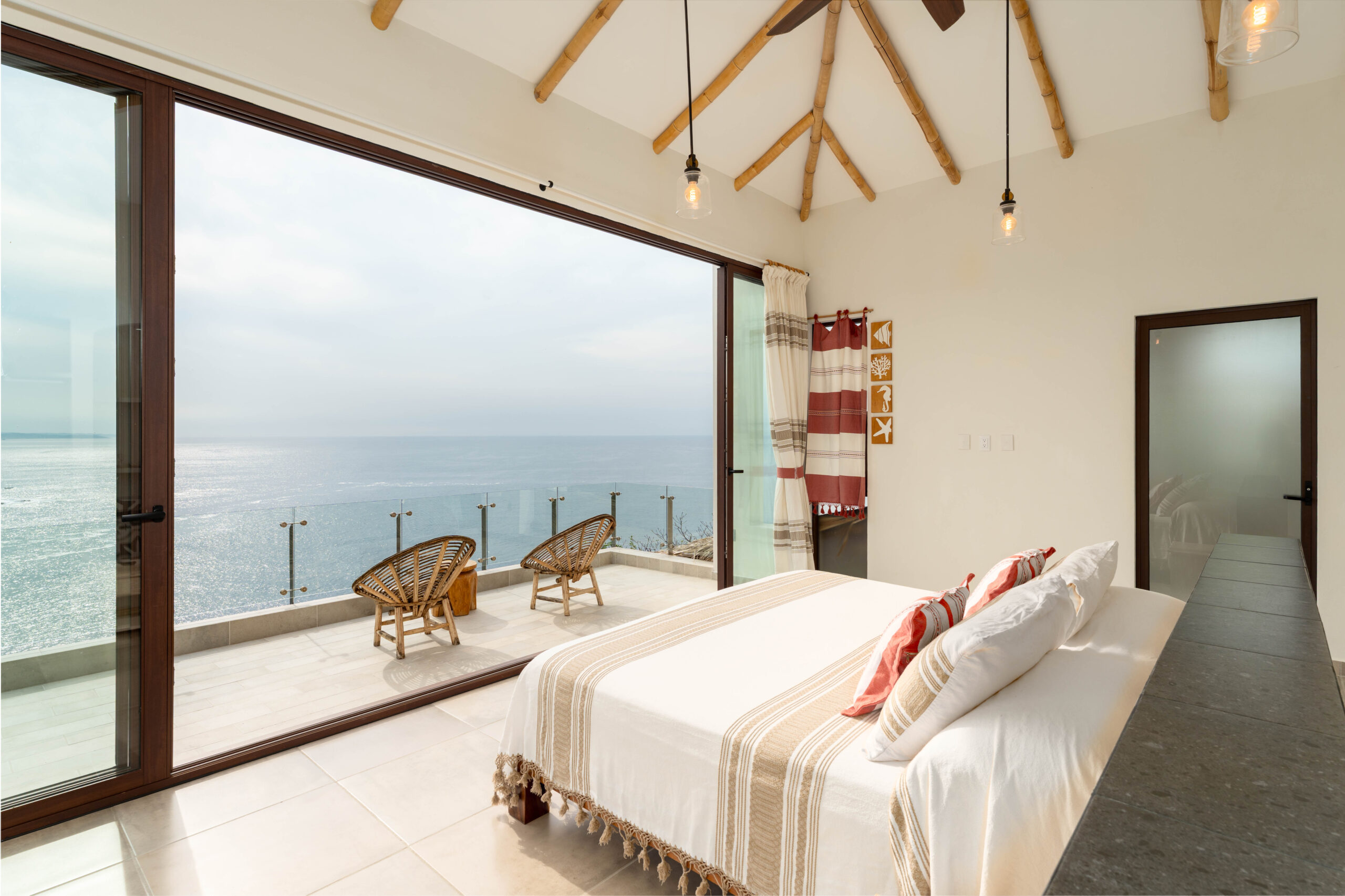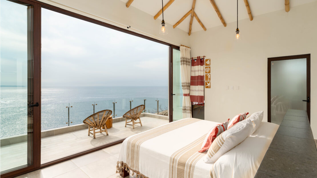 The principal bedroom is a sanctuary with dramatic views of the ocean, complemented by a luxurious en suite bathroom where even the shower overlooks the sea. Throughout the home, high-quality finishes such as aluminum doors and windows with a warm wood finish add style and durability.