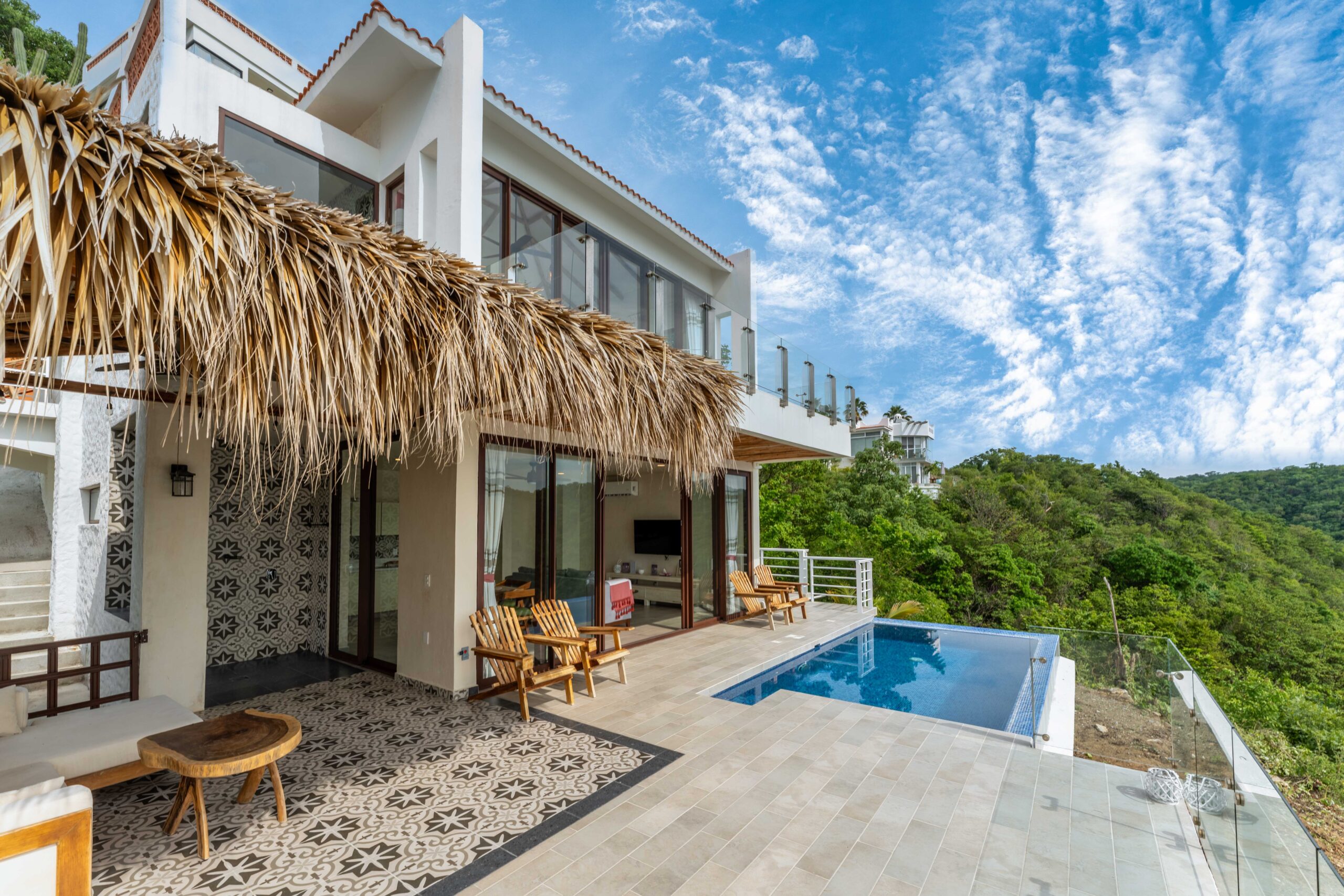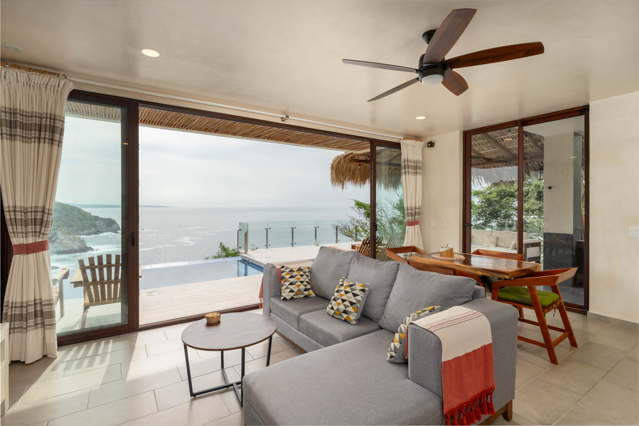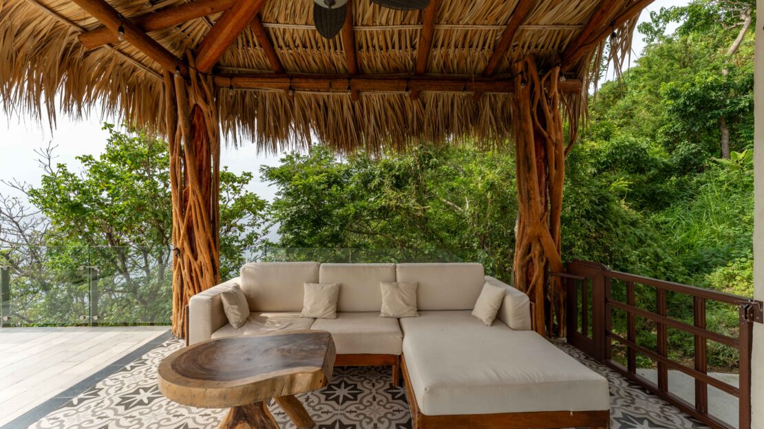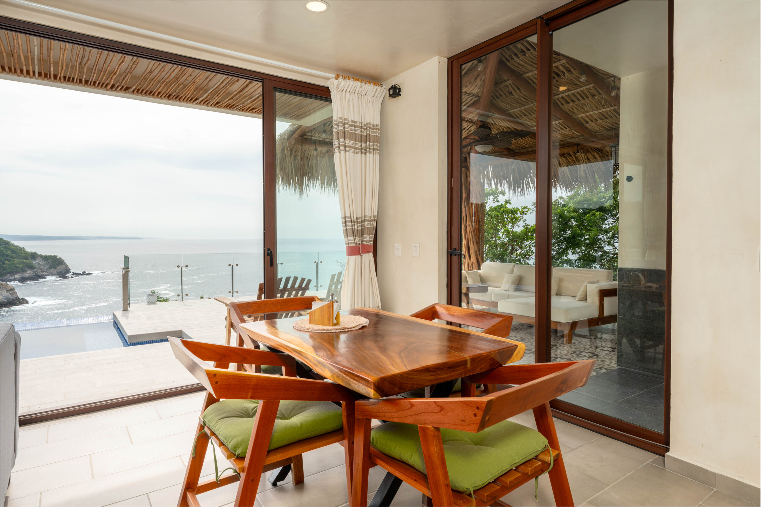 The home is thoughtfully laid out over two levels, with spacious open-concept interiors that flow seamlessly onto expansive terraces. Both bedrooms and the main living area open to large outdoor spaces, designed to maximize the breathtaking ocean views. A palapa-covered terrace provides a shaded lounge area, while the private pool and outdoor shower invite you to embrace the coastal lifestyle year-round.