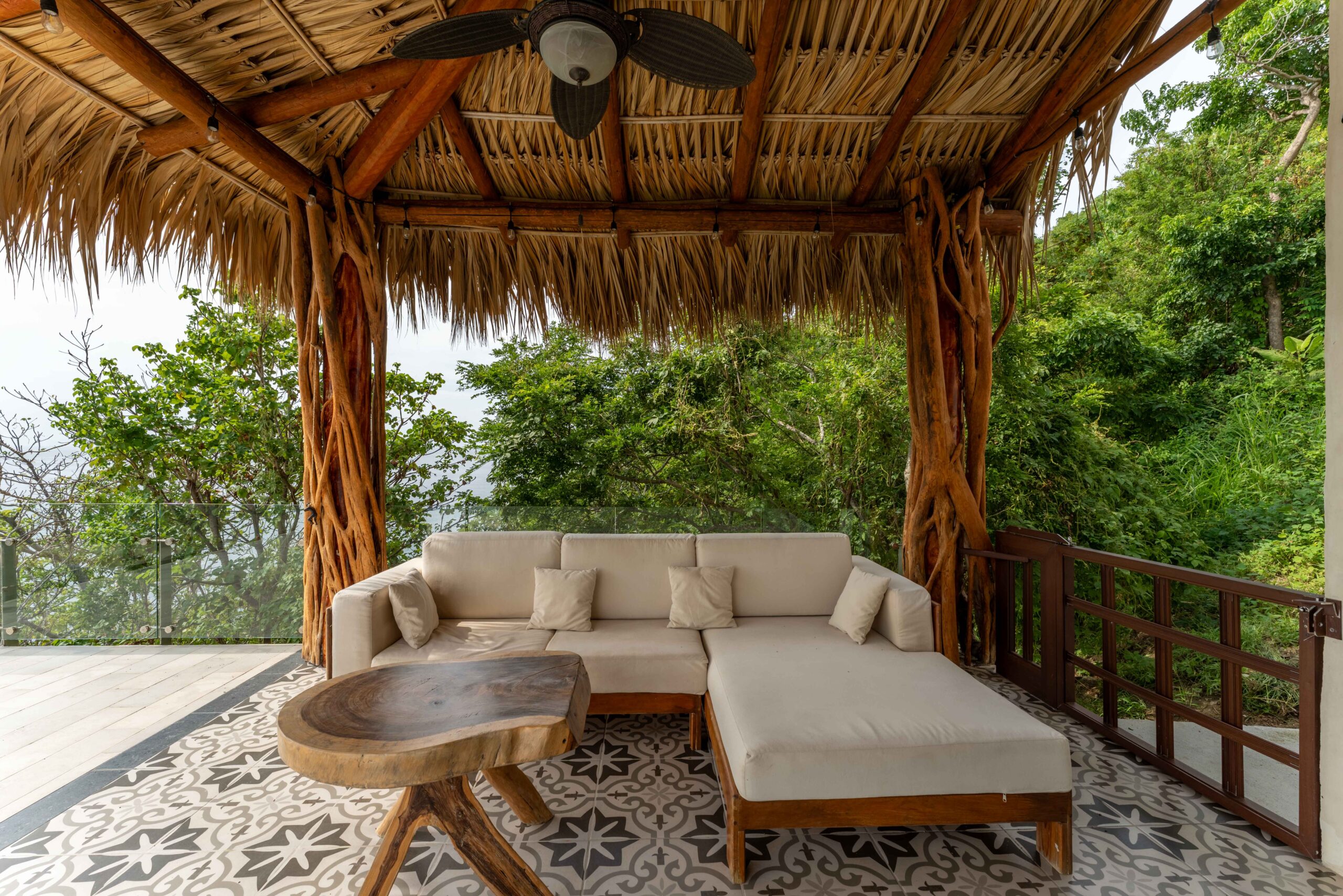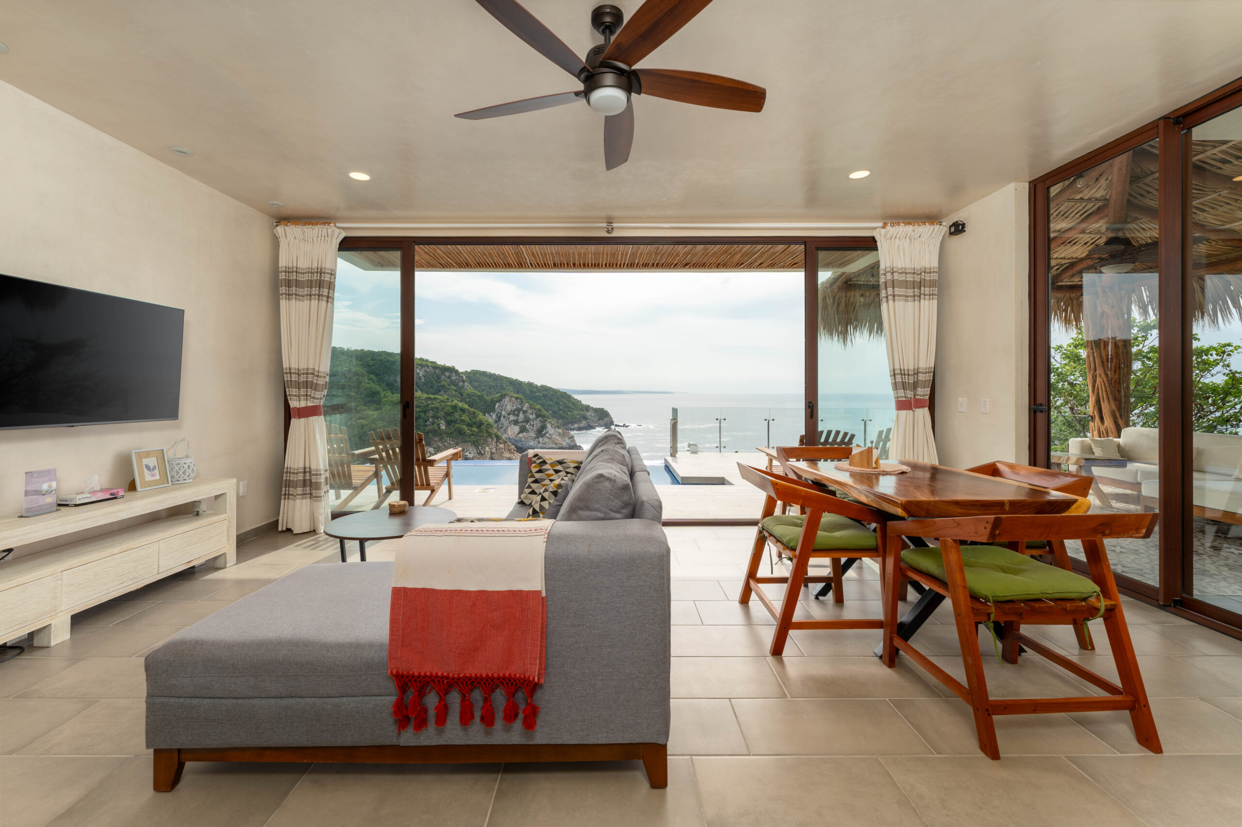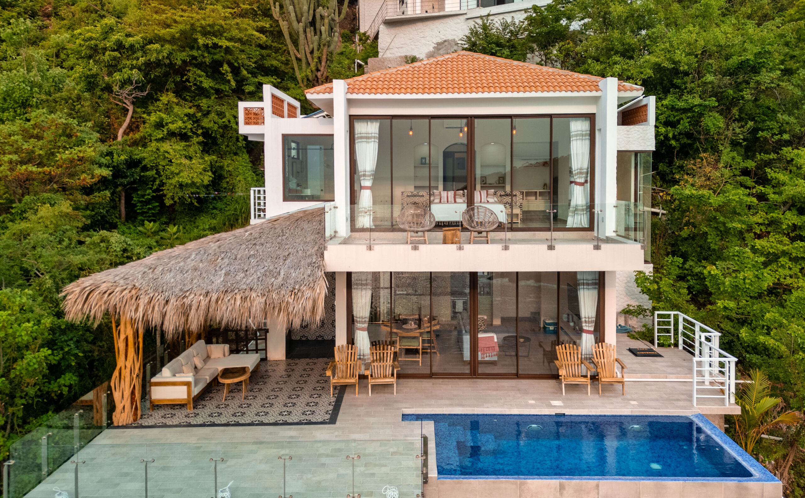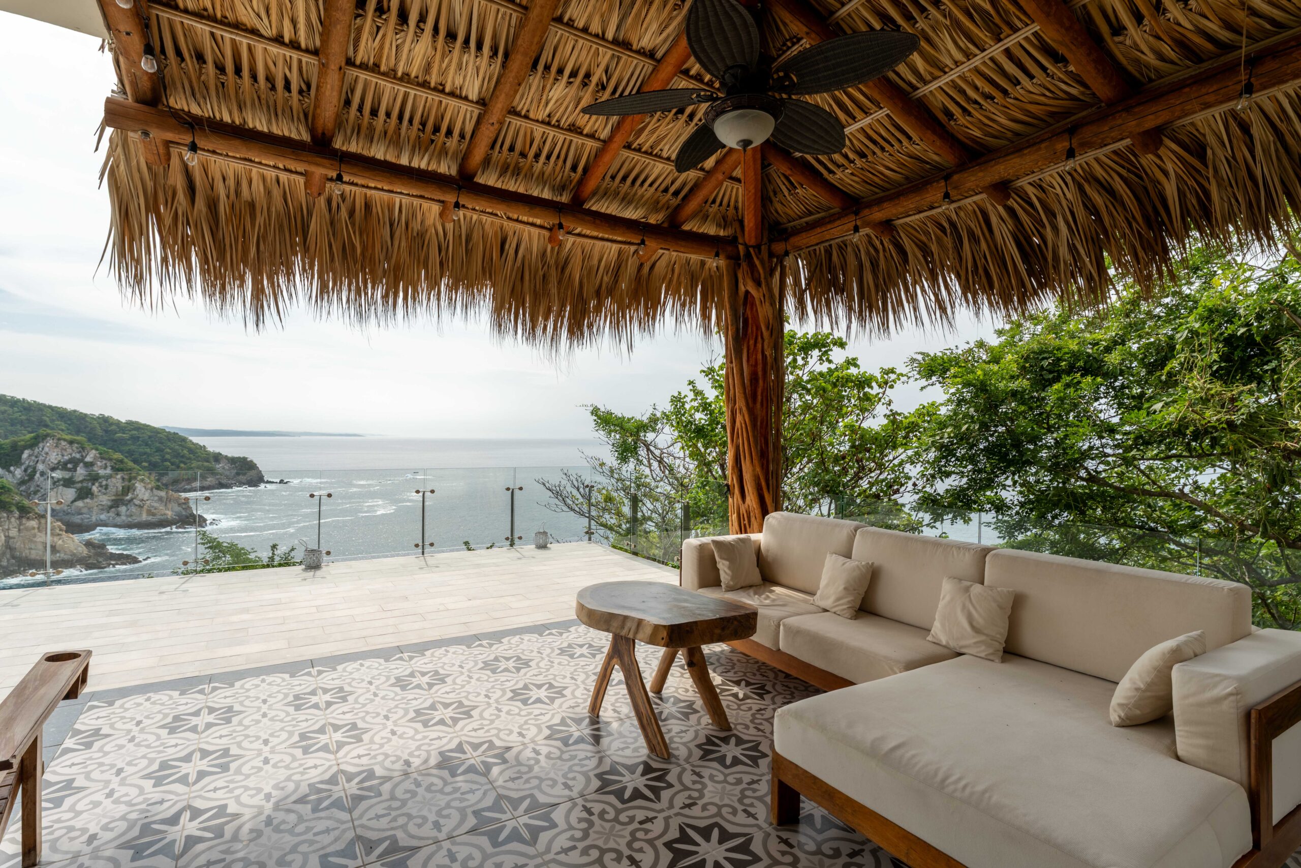 The home is thoughtfully laid out over two levels, with spacious open-concept interiors that flow seamlessly onto expansive terraces. Both bedrooms and the main living area open to large outdoor spaces, designed to maximize the breathtaking ocean views. A palapa-covered terrace provides a shaded lounge area, while the private pool and outdoor shower invite you to embrace the coastal lifestyle year-round.