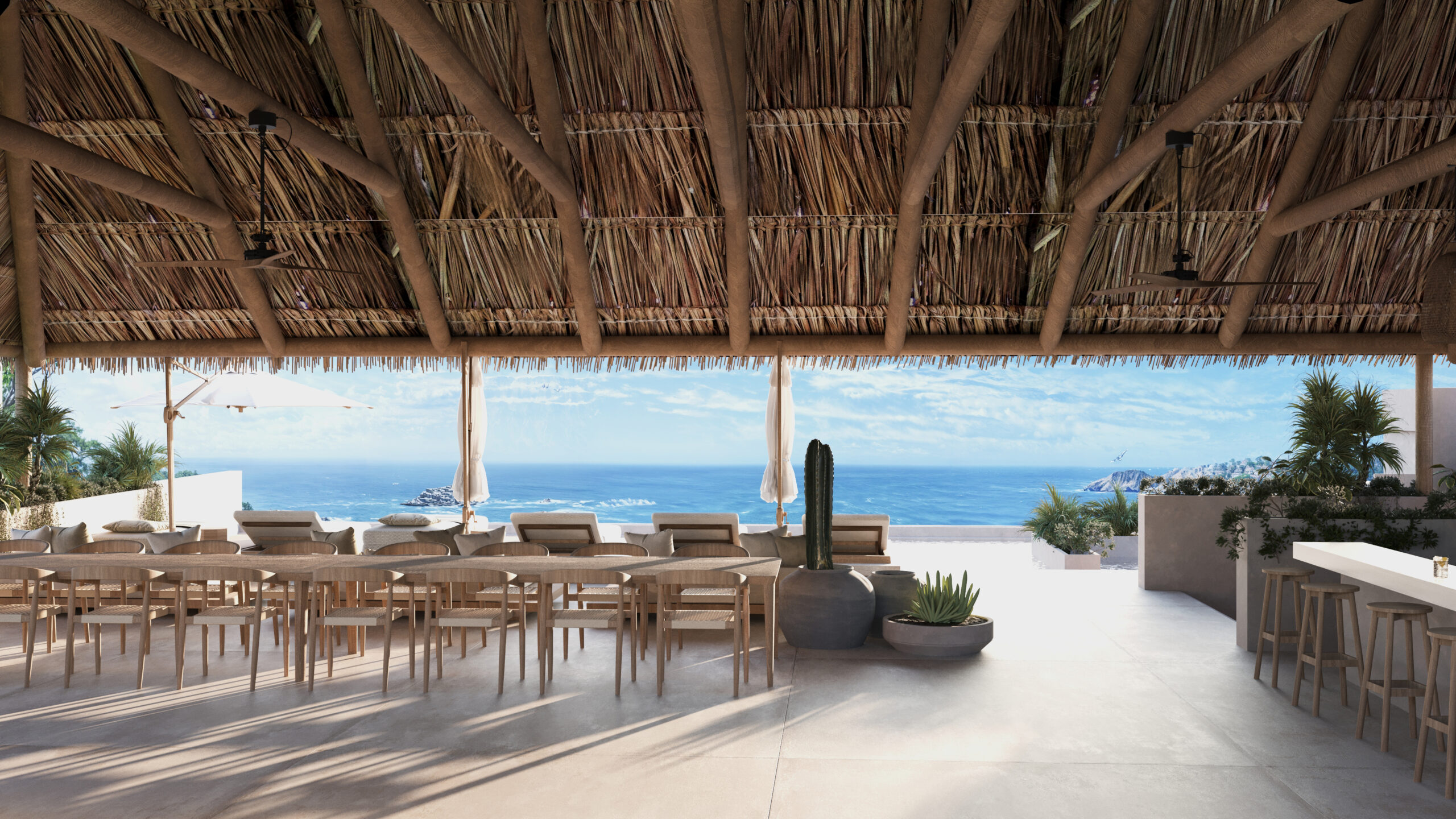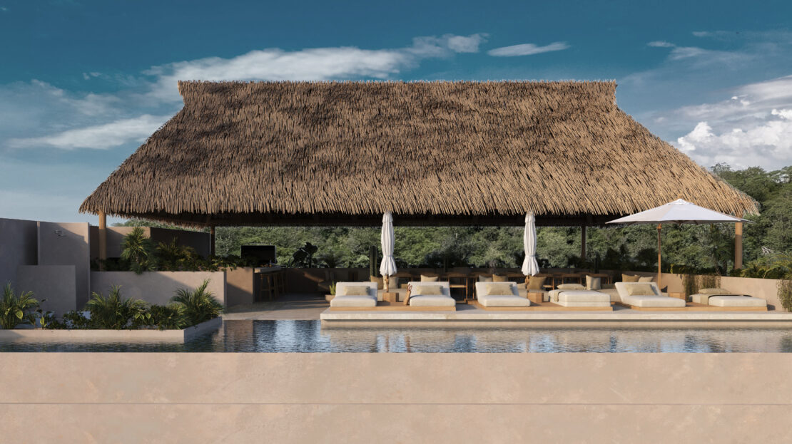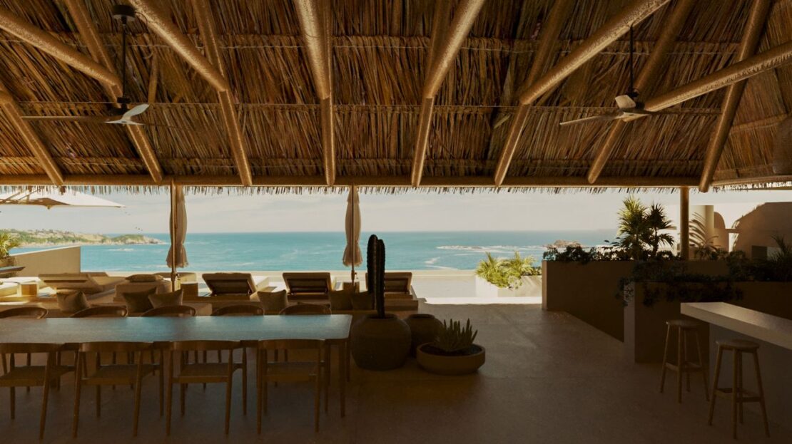 Beyond the privacy of your villa, Oceanside Residences offers a complete lifestyle centered on health, relaxation and connection. Residents enjoy a full oceanfront wellness center with a fully equipped fitness room overlooking the Pacific, a treatment room for massages and spa services, a dry sauna, steam room and cold-water plunge for total mind-body balance. The rooftop sky lounge adds another layer of luxury with a long lap pool, relaxation pool, jacuzzi, daybeds, palapa-covered lounges, a bar and grill area, and even a golf simulator, all set against dramatic ocean and island views.