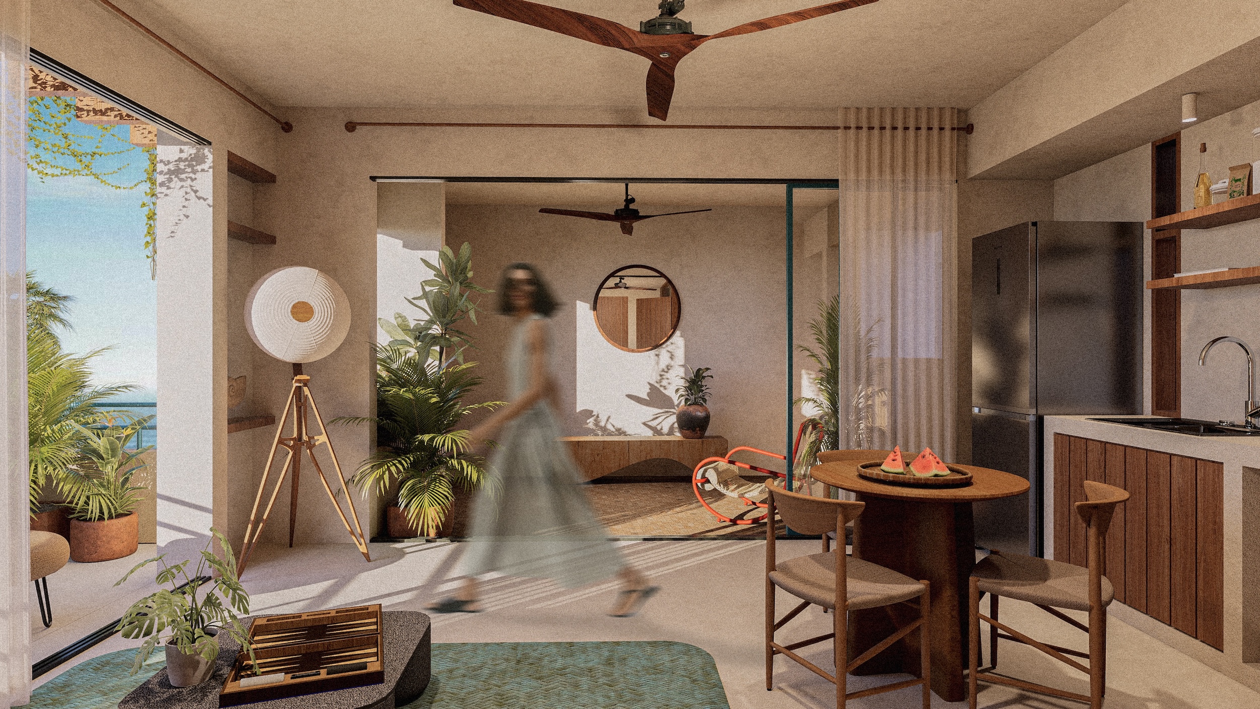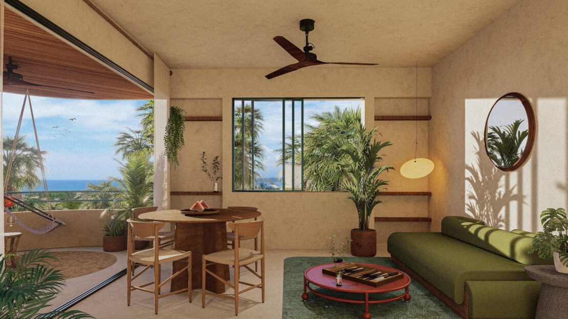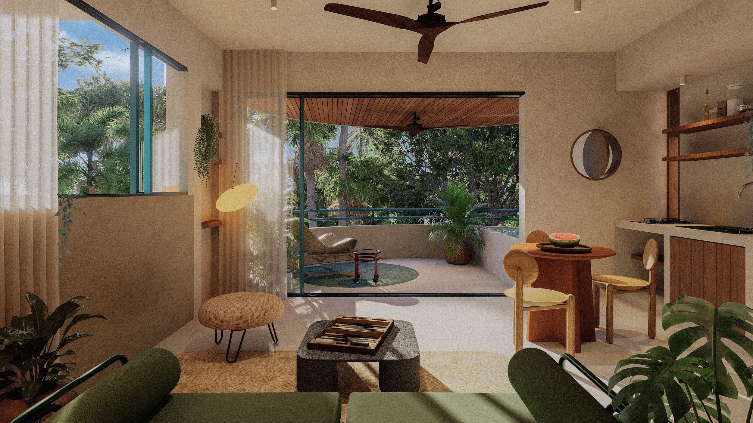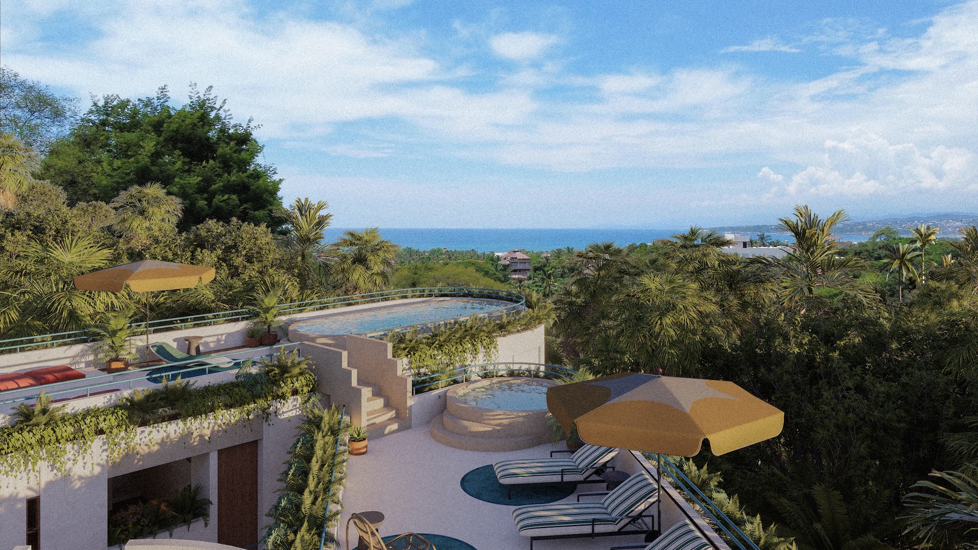 Panorama is a boutique collection of branded residences by Suuel Hotel, thoughtfully set above the Pacific in the tranquil enclave of Puerto Escondido, just moments from La Punta Zicatela. Surrounded by lush vegetation and defined by unobstructed ocean views, the development offers a rare balance between privacy and proximity, where the rhythm of the coast, the sound of the surf, and the natural landscape shape everyday living in Puerto Escondido. Currently available residences include a limited selection of studios and 2 bedroom apartments, ranging from approximately 281 to 975 Ft2. Each unit is designed to maximize natural light, airflow, and seamless indoor-outdoor living through terraces and balconies that frame garden or sea views. Inspired by the golden era of Mexican Pacific architecture, interiors feature polished concrete floors, soft ivory walls, sand-toned balconies, blue metal accents, and warm wood details, creating spaces that feel timeless, relaxed, and deeply connected to their surroundings.